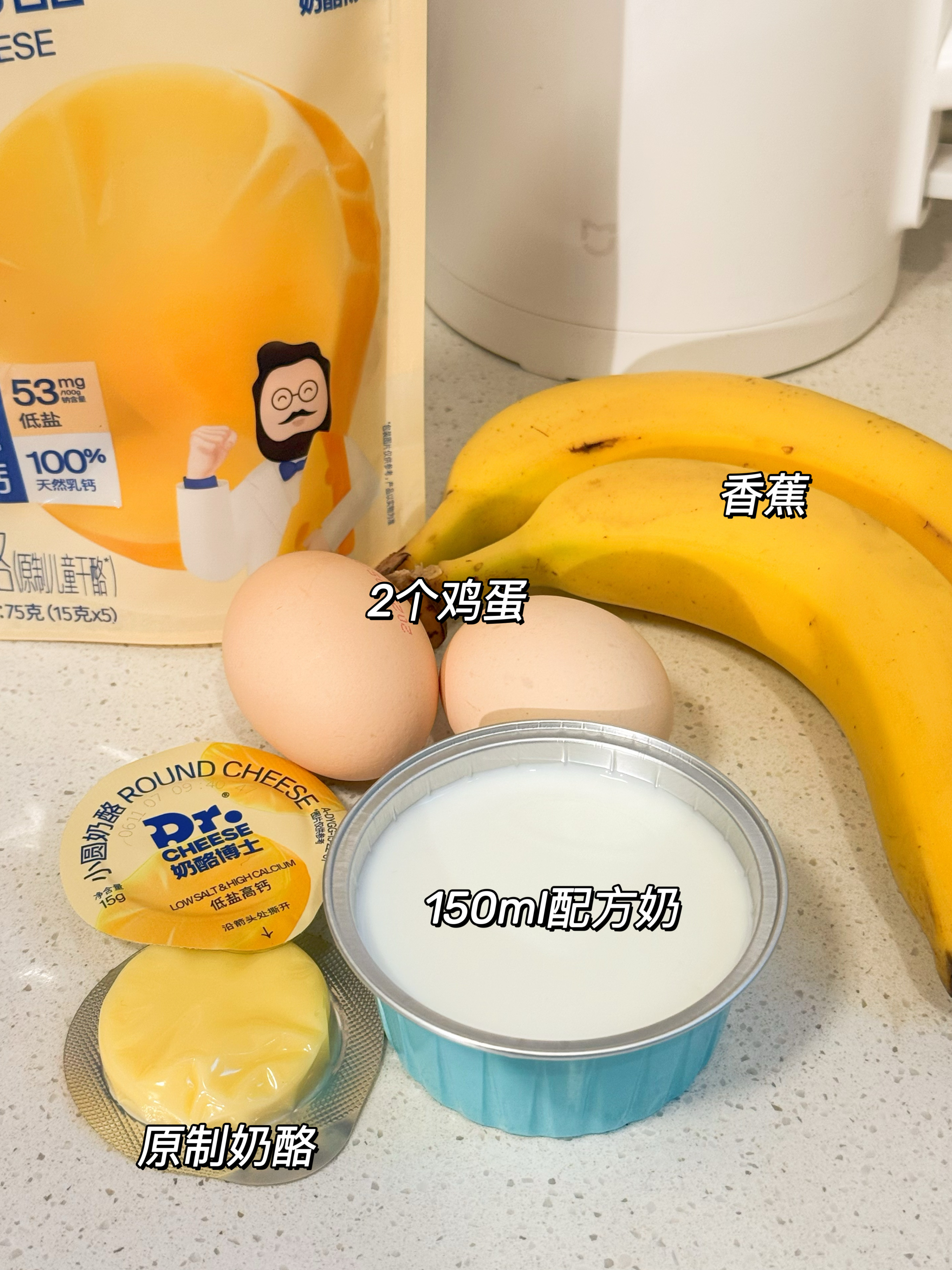 小圆奶酪🟡、鸡蛋🥚、配方奶🍼、香蕉🍌
