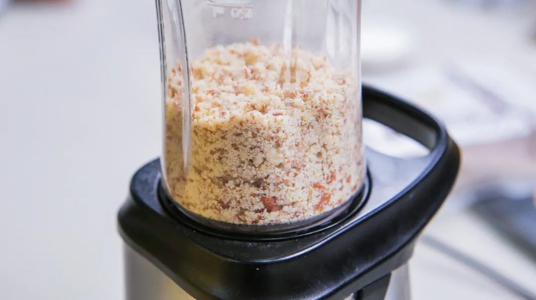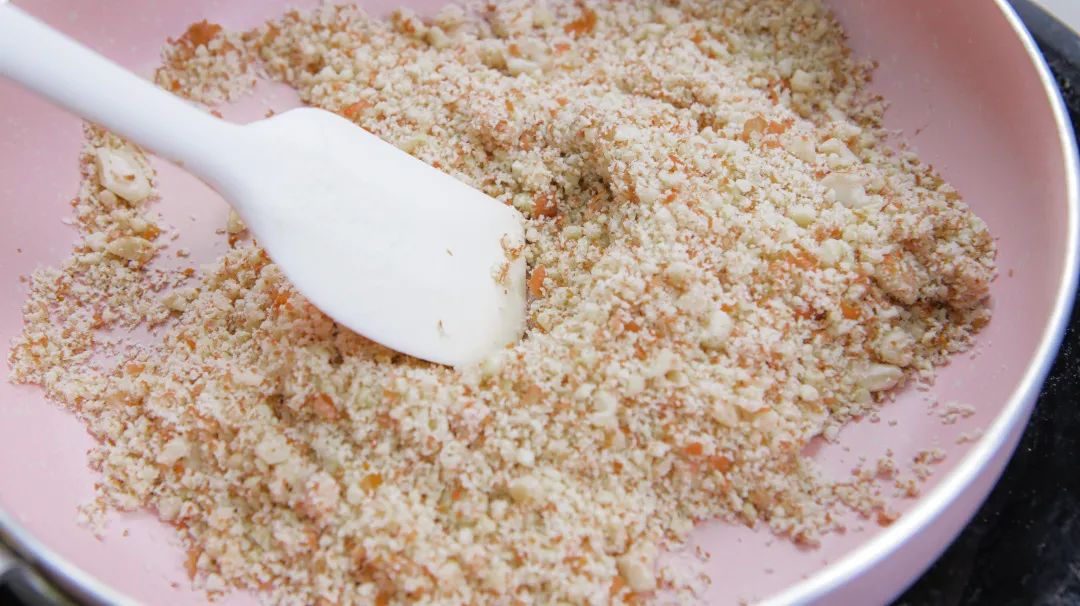3/用平底锅将花生碎炒熟,炒至微微发黄就熟了,如果家里没有料理机,也可以整粒炒制,最后装入袋子用擀面杖擀碎即可;