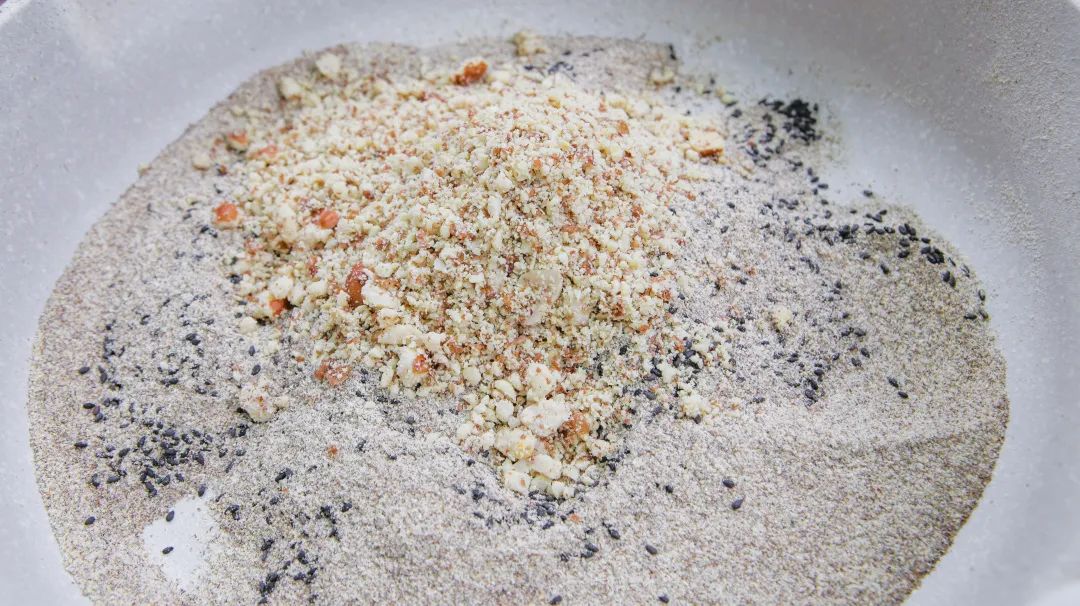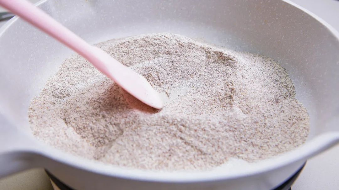 4/准备炒面,将新良黑全麦粉倒入锅内,中火炒至颜色变重,并且含有较浓的麦香味;