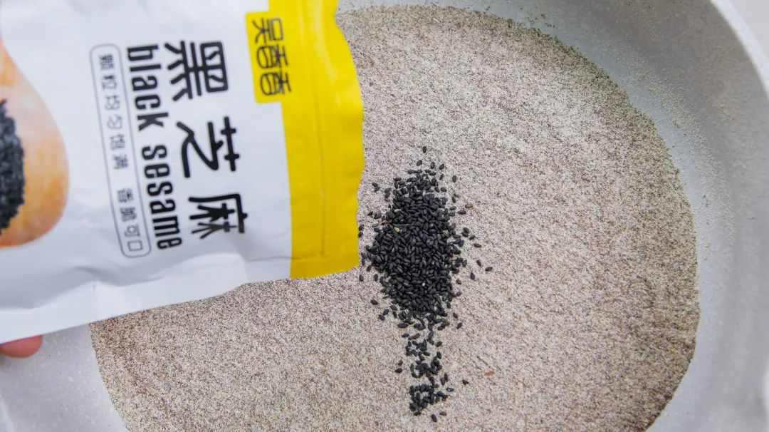 5/倒入芝麻,因为我选的芝麻是熟的,所以直接倒入了,如果是生的芝麻,需要额外炒熟,这样会更香;