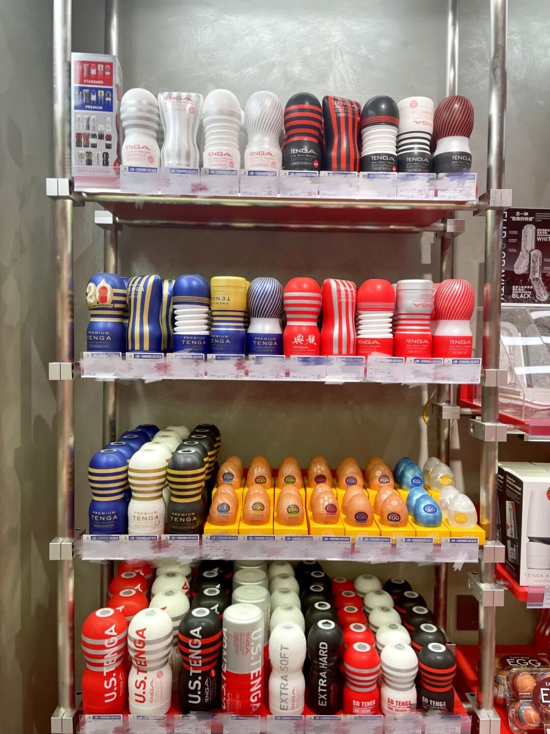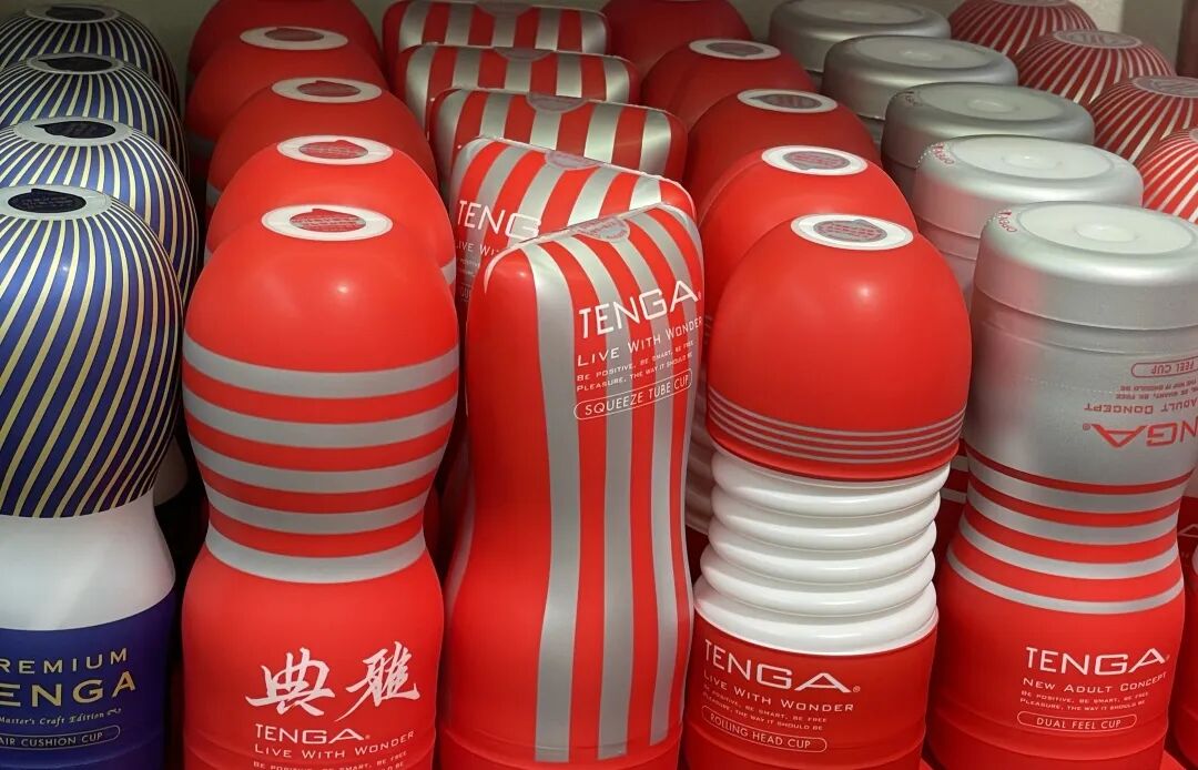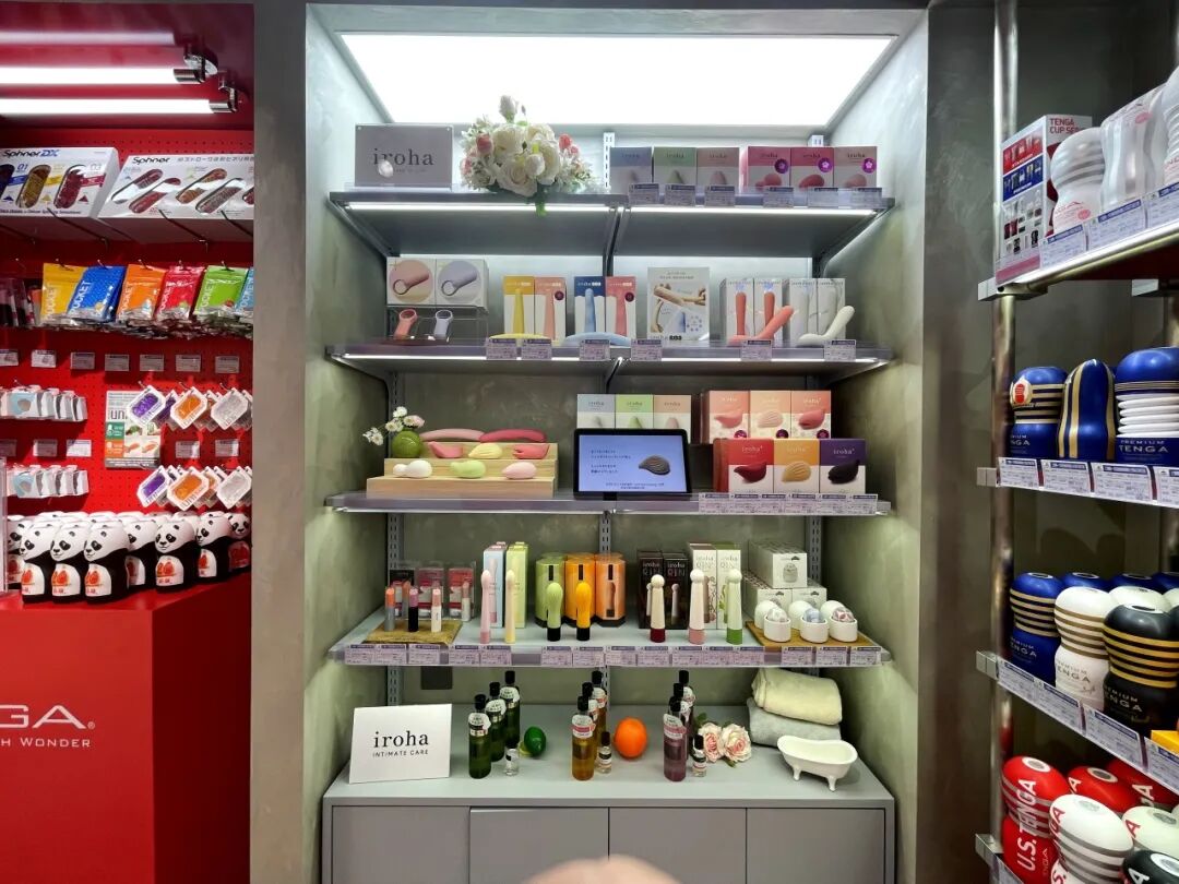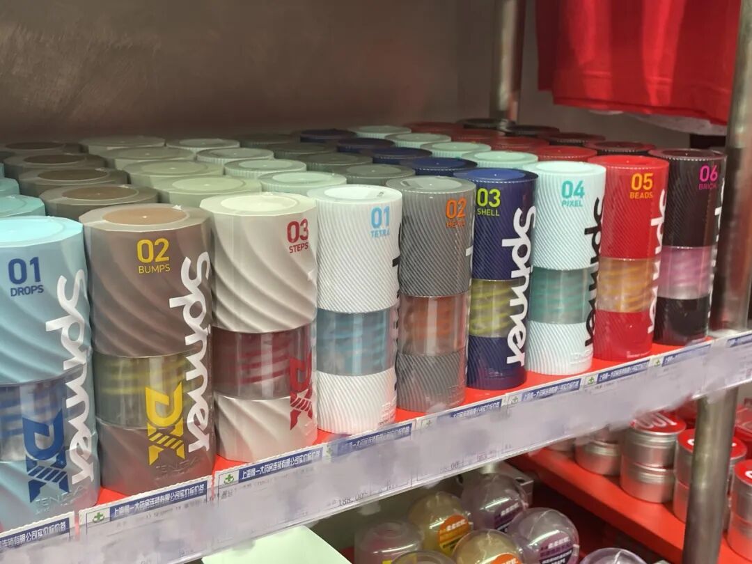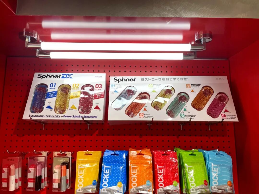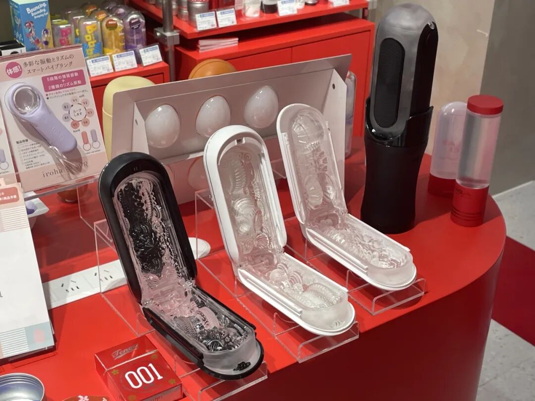 进入店铺首先映入眼帘的便是TENGA鲜红色的展台,上面摆满了各式各样的TENGA飞机杯、飞机蛋、震动棒等玩具。