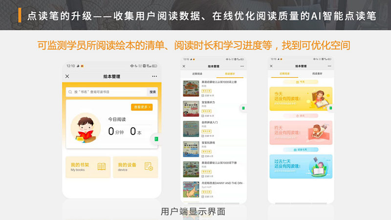 点读笔AI技术应用方向:在线收集阅读数据,家长直观可见孩子阅读情况,教师可以根据云端数据在线干预并优化孩子在家的阅读质量