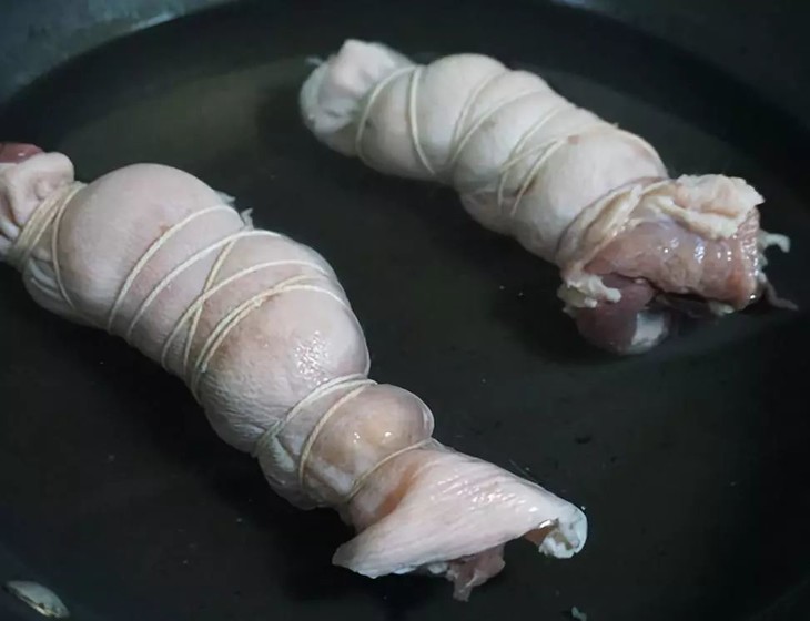 1、把肘子肉从冰箱里取出,卷起来,把多余的肉切掉,用棉线卷紧;