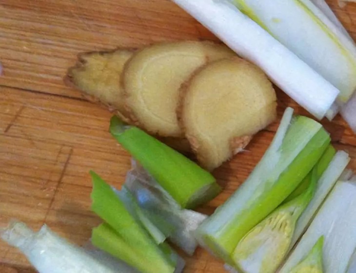 3、把葱切成15~20厘米长的段,姜切2~3大片,葱姜都用刀背拍一拍;