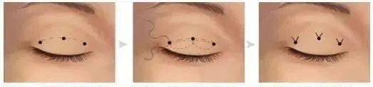 在眼皮开三个小口,通过三个小口去除脂肪和组织,进行缝合后形成双眼皮。