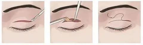 即在上眼皮出切开,去除多余的皮肤及脂肪组织,然后将眼睑皮肤固定在所需高度的睑板上形成重睑。