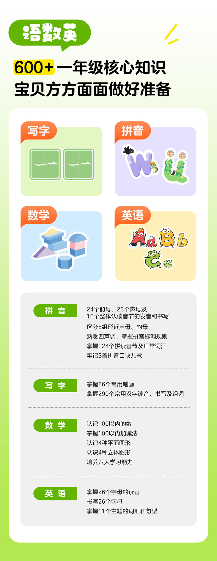 💁涵盖一年级必须掌握的语数英全科知识,内容涵盖拼音+写字+数学+英语,四大类知识