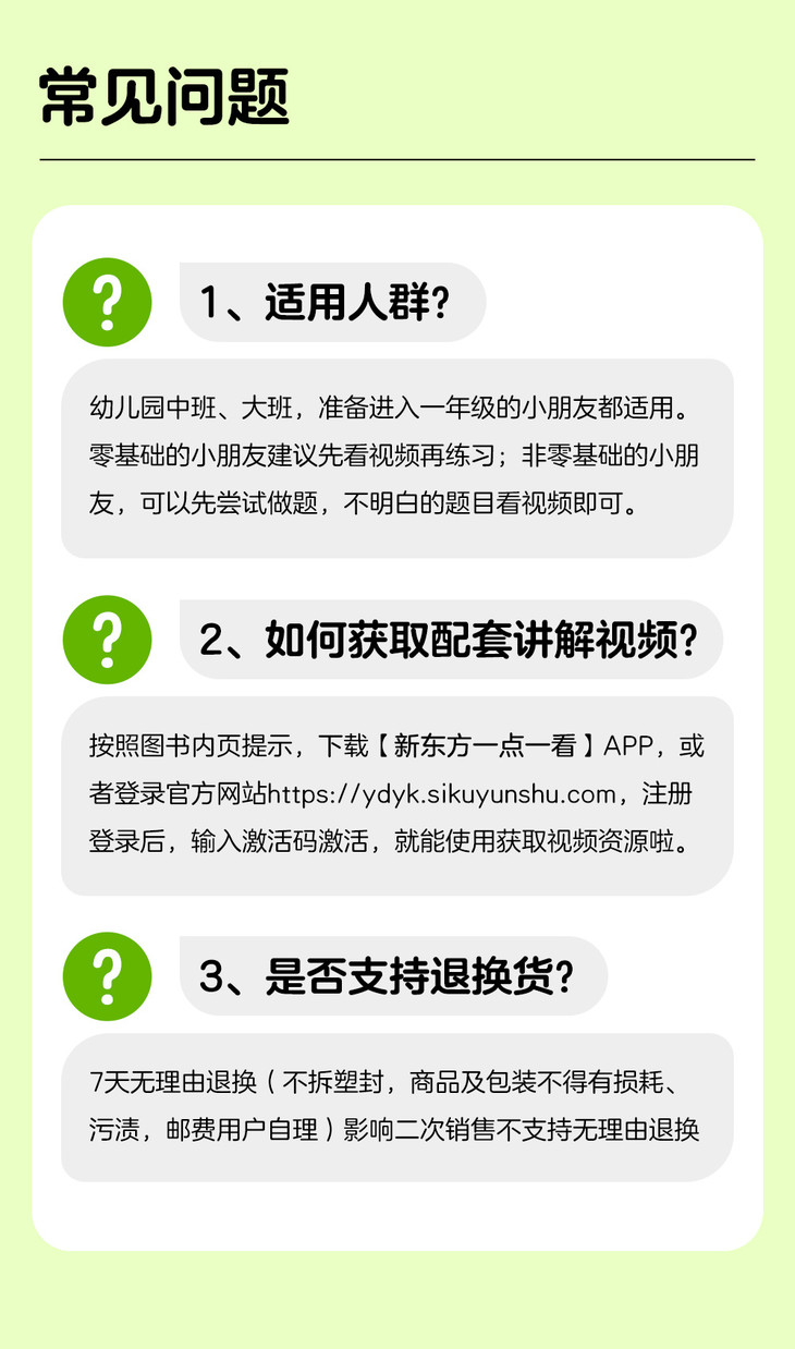 ⭕️集“教学视频+练习”于一体,知识点科学规划,按照每天一页的学习节奏,预计15周养成规律的学习习惯,做好小学入学知识储备
