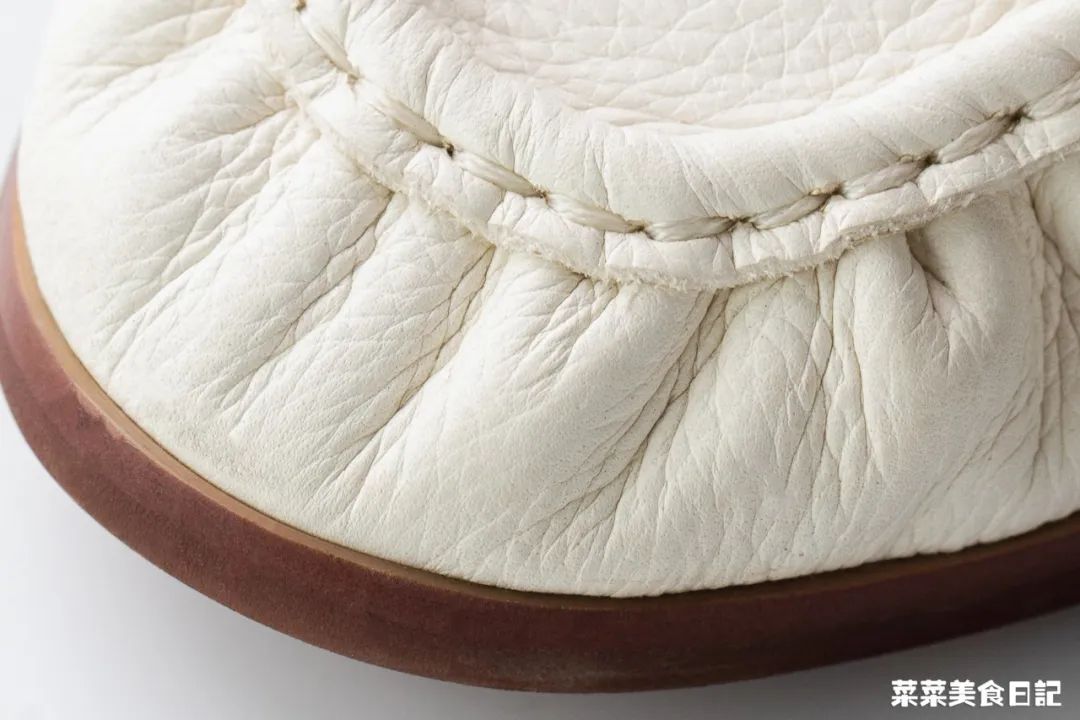 它可是今天这3双鞋子里面,用料特别,且非常费手工的一款。 鞋头部分的褶皱,都是由人手工一点点折好、手缝/车缝而成。一针一线都蕴含着工人匠心,处处透露着精细的高级质感。