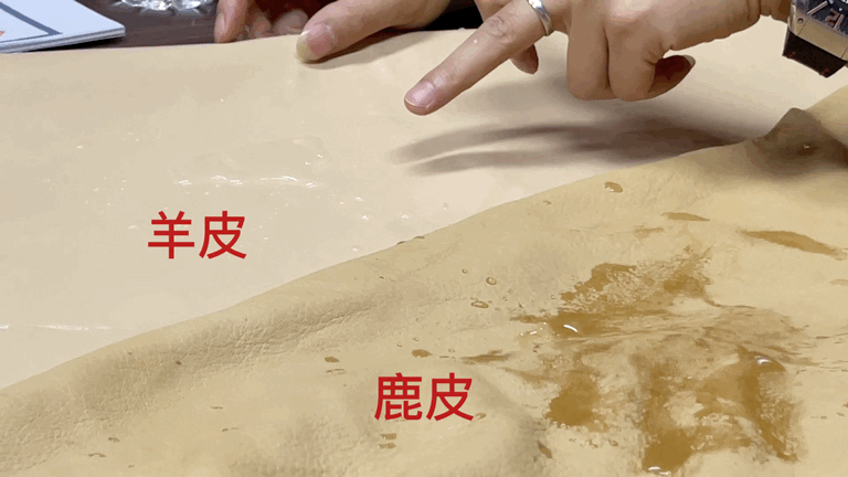 KD自家的水染鹿皮:没有经过涂饰压花,保留了天然毛孔,水一下就渗