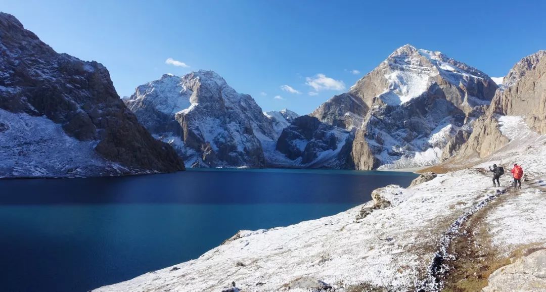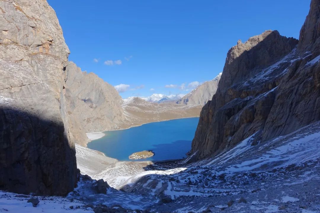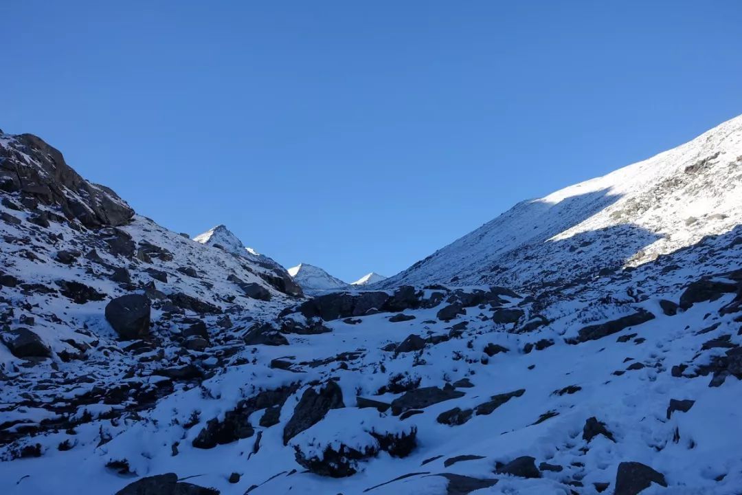 爬到半途,有一处相对平缓些的空地。这里已经足够高,可以看到二湖了,只是它那大半结冰的湖面在照片中呈现出来是灰色的,在四周的白雪和灰色石头中不够明显,得仔细看才能发现。
