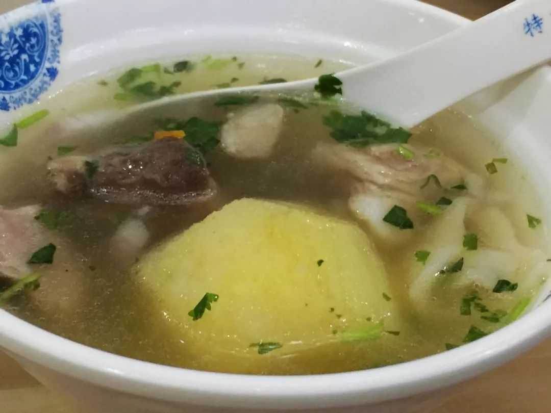 揪片子就是面片,新疆的汉族人称为汤饭。伊犁的揪片子是用羊肉汤作底,放上土豆、胡萝卜、西红柿、青菜、蘑菇等,再加上面片和羊排,弄成的大杂烩羊肉面片汤。这种揪片子既是菜,也是主食。现在想起来,我仍觉得太好吃了,不管是羊肉还是土豆或是面片还有那汤,都是美味。这个招牌菜很给力,分量很大,大家点菜时别高估了自己的战斗力。