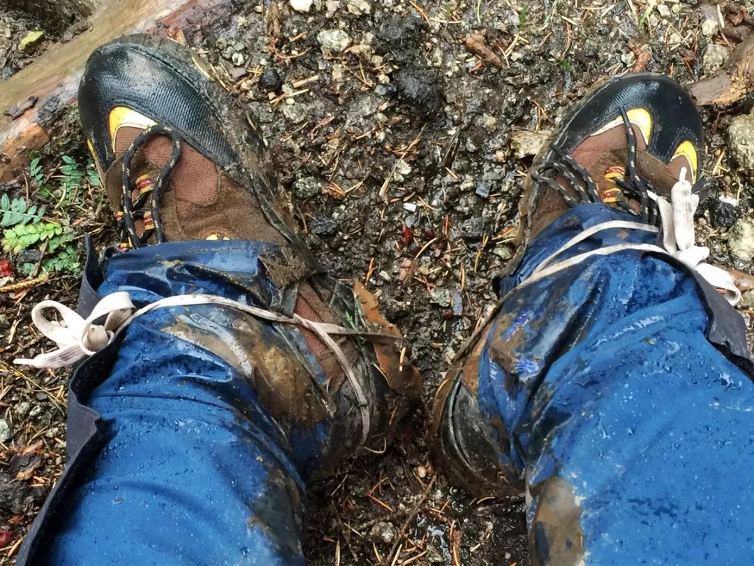 继续前行没多久,我忽然感觉脚上不对劲。停下脚步,仔细一看,尼玛,右脚鞋底脱胶了。这时离开始徒步还不到1个小时。且不管了,再坚持一阵,等走到营地再想办法。于是继续前行,没过多久,左脚鞋底也脱胶了,卧槽,这俩果然是一双鞋,同生死共患难。依然不管,继续前行。后来用之之用来绑背包罩的鞋带把鞋底绑起来就好了些。