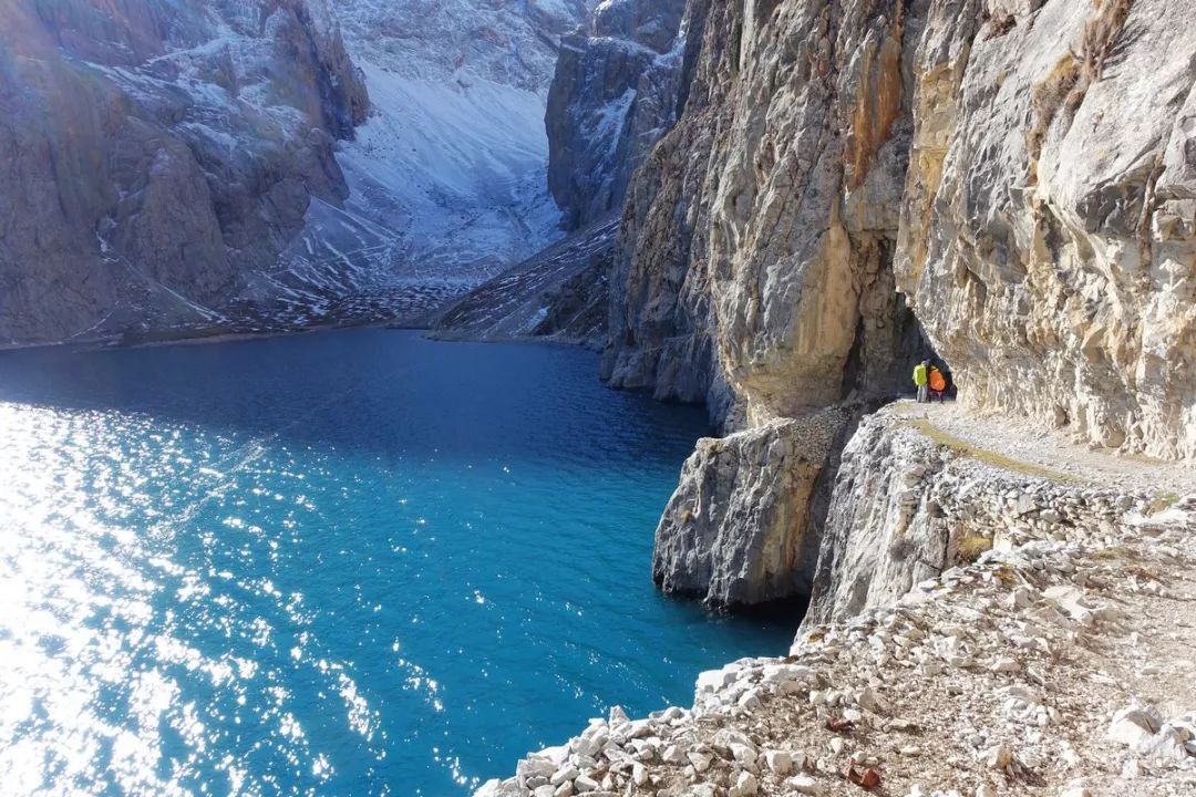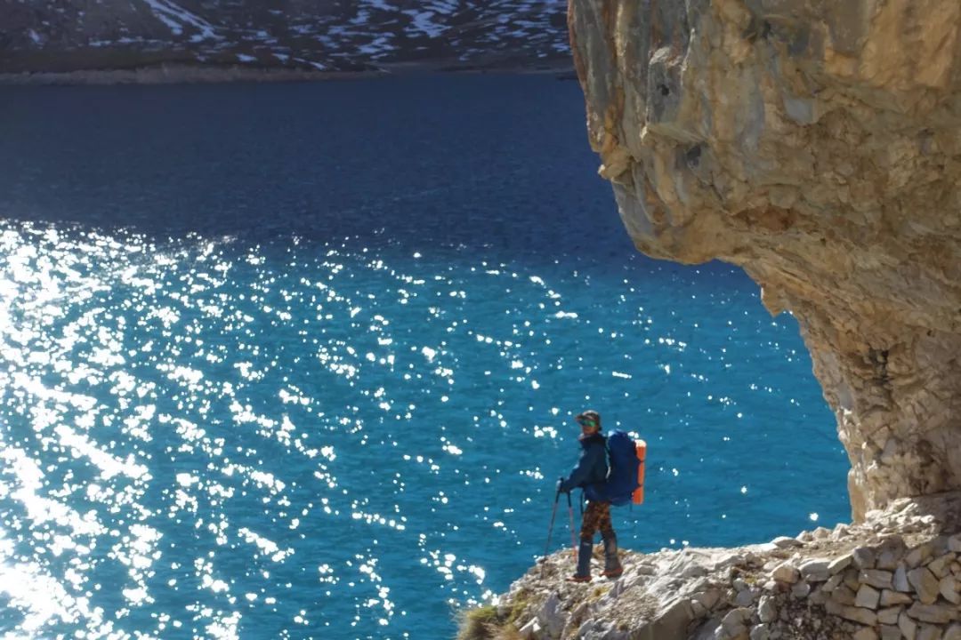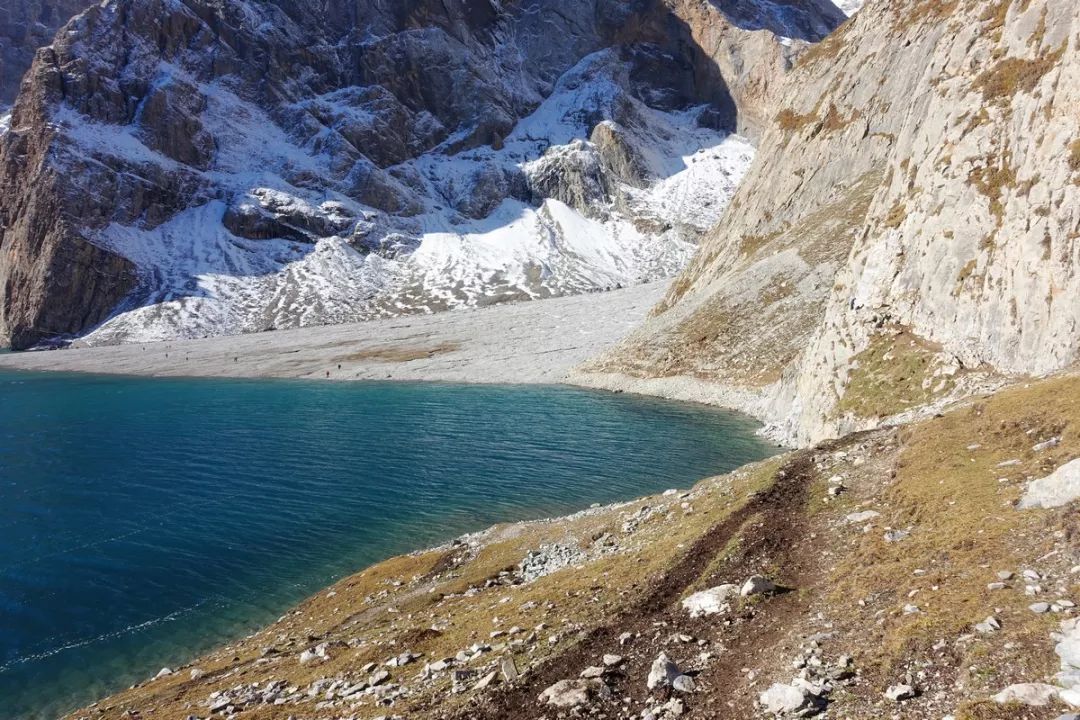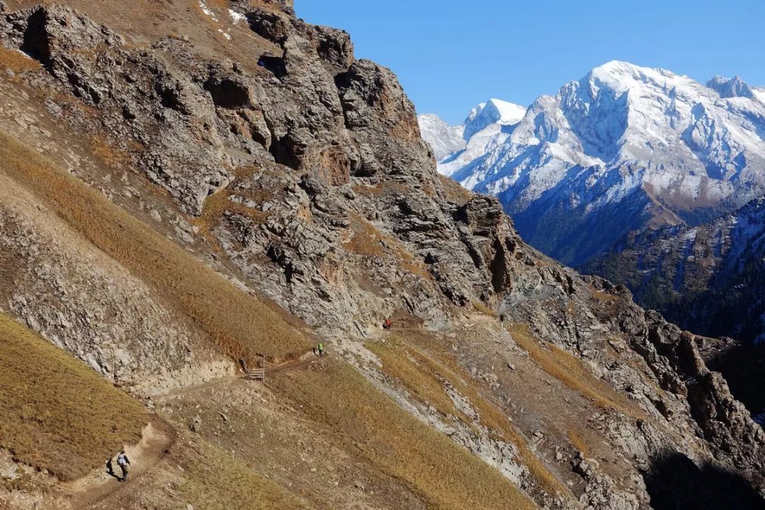 这一段山腰上的小路,向着雪山迎面而行。看起来有点险,但走起来很轻松,因为路面通常都有1米左右宽,最窄的地方也有半米。如果是雨雪天气或是积了水或雪,就得小心一些,但晴天且地面干燥,那是毫无压力。