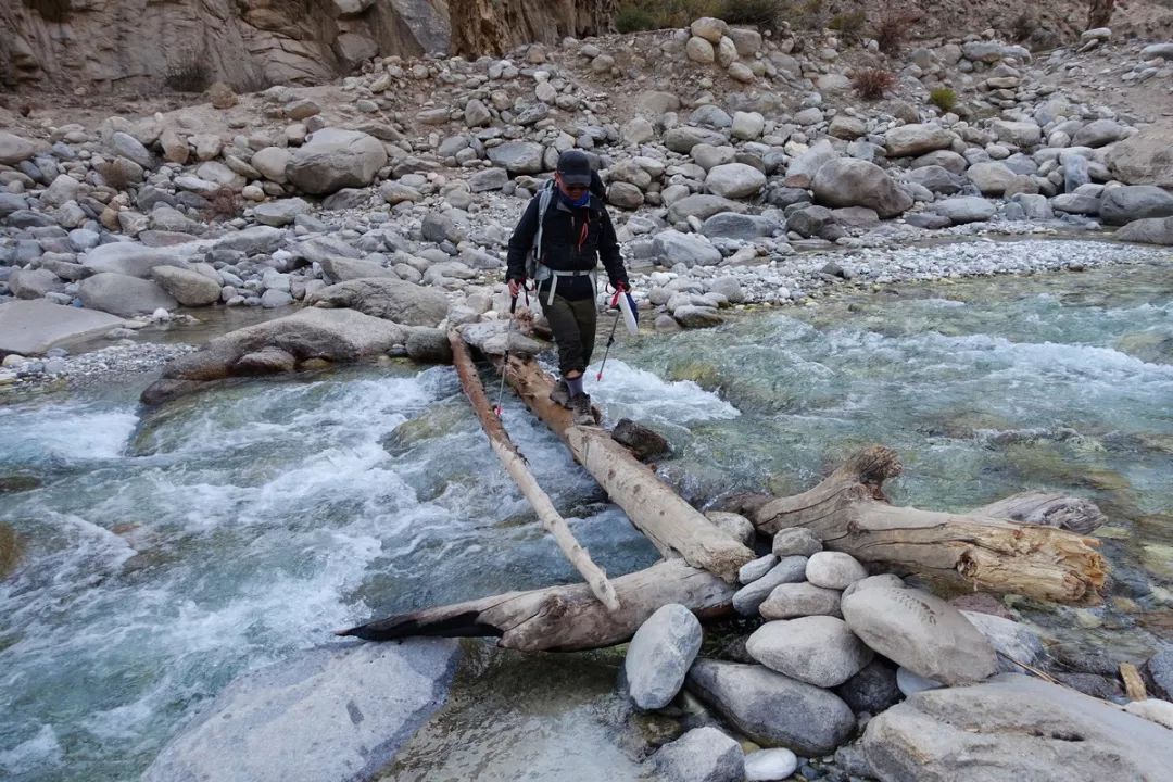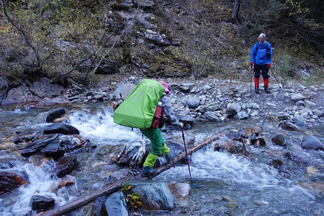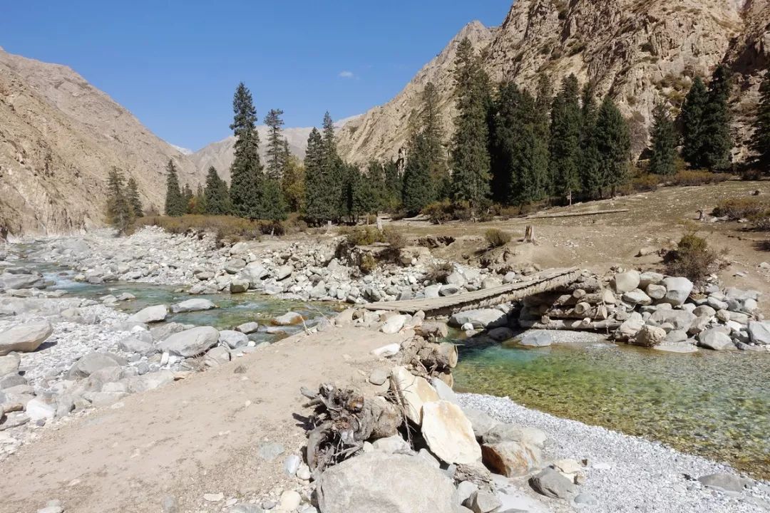 下到科克苏河边之前要过支流的河道,大约4次,也可以说成是溪。下图这处过河有独木桥,算是这几次过河中中等难度的,最简单的是踩着石头就能过,最难的地方我是趟水过的。