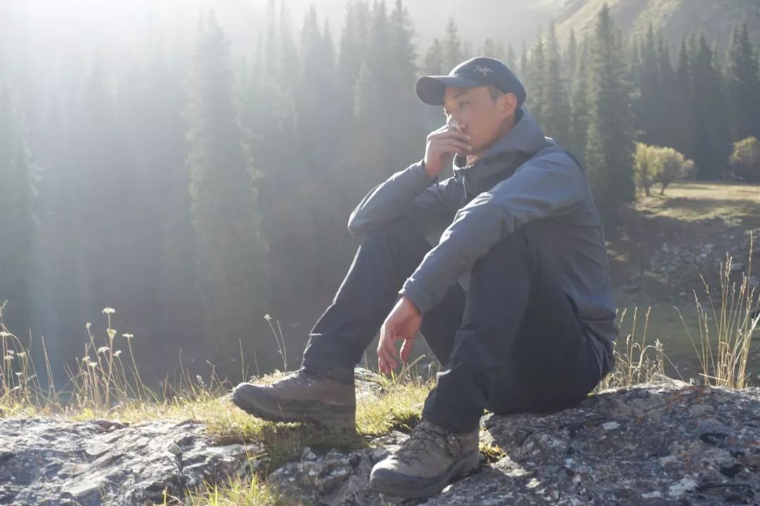 出发前留影一张。今天穿的是潘哥的登山鞋,刚好我俩是同一个码数。反正现在他是骑马,用不着登山鞋,所以我就借来穿了,他穿他预备过河用的网面溯溪鞋(潘哥后来走残了,从第二草原站营地开始就变成骑马了)。