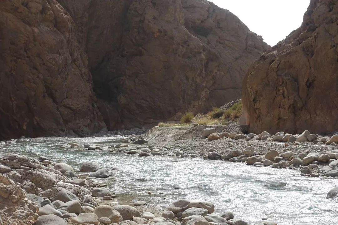 接近出山口的河道相对较宽,河水也较深,稍有点急,需要选好合适的过河点。从那片草坪末端的河岸边出发,走了将近40分钟,终于看到了传说中的堤坝。