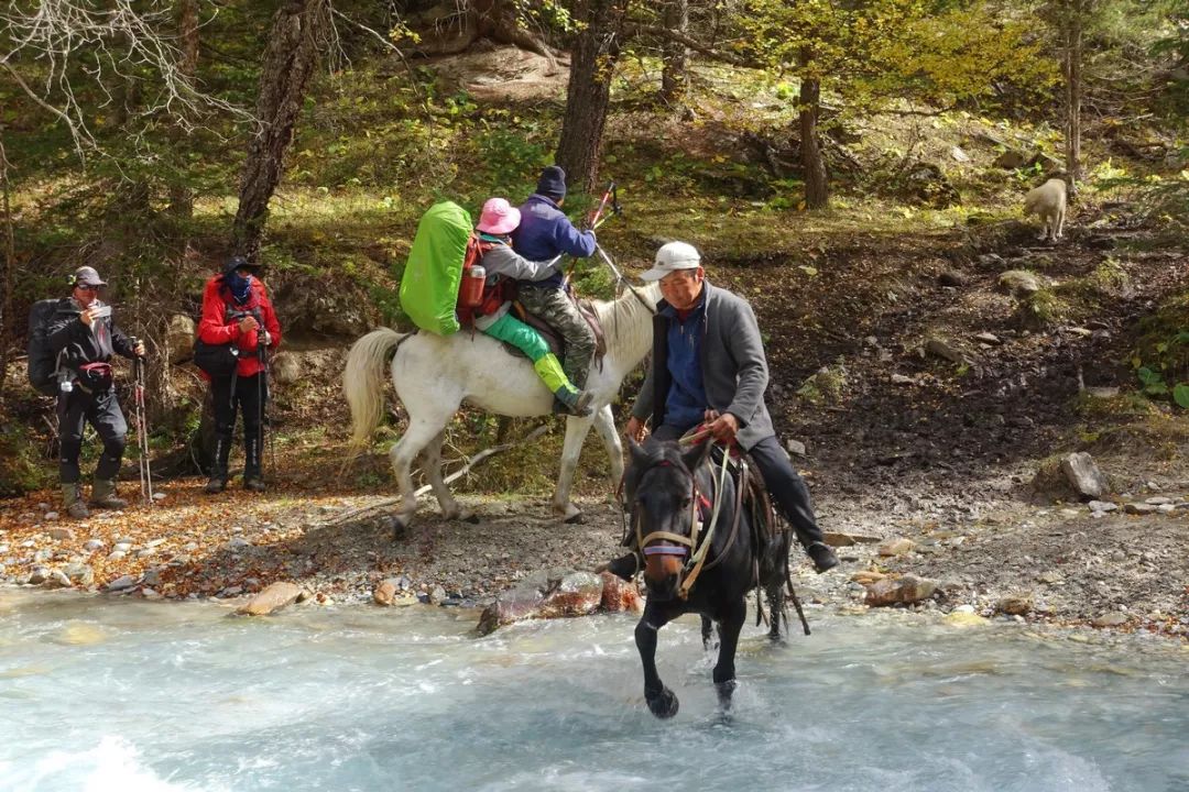 没能找到合适的独木桥,准备强渡。这时来了两个骑马的牧民跟我们谈过河的生意。靠着绳子、主锁、扁带等过河装备,我们跟牧民谈好了一个不错的价格,每人一张毛爷爷,骑马过7次河。