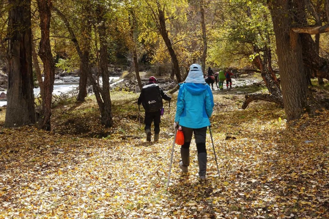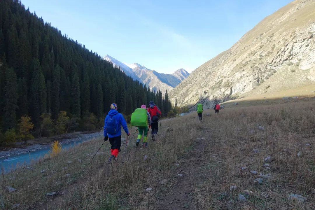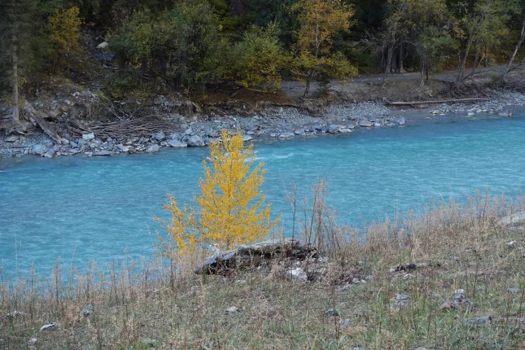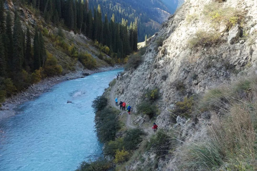 从河谷营地到溜索处的这一段路,沿途看到的秋景有点像几年前从贾登峪徒步到禾木的沿途景色。但科克苏河边的这段路要险一些。