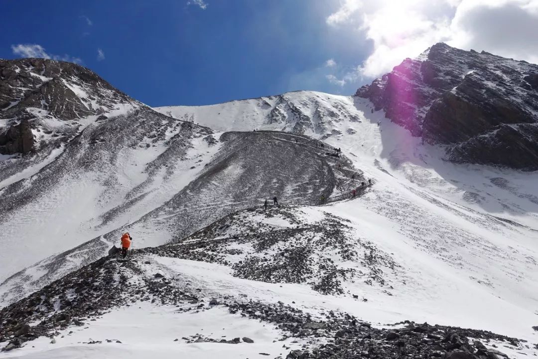 反C坡的上部比下部要陡一些,目测坡度到了40~50度。这样的坡度,再加上山坡上的积雪,让人有登雪山的感觉。站在那里,仰头望向达坂顶,真心感觉到人是多么渺小。但当你看着头顶上一个个蚂蚁似的人始终在往前蠕动着,你就知道你也会干上去,然后你就一步一步地挪上去了。