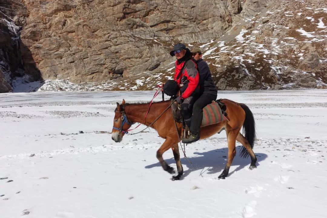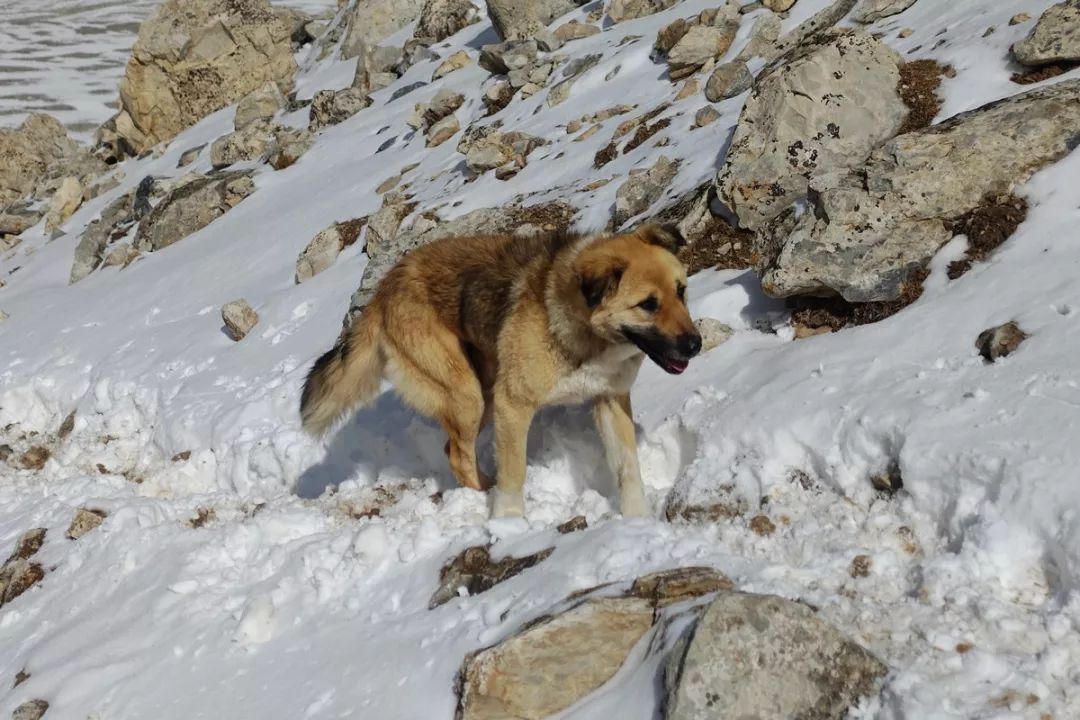 然后就是小黄,这家伙是抱马帮大腿的。这片山坡上积雪厚。度差不多到小腿中部,局部位置要到膝盖处。马道上因为是徒步旺季每天被马匹和人踩踏,路迹非常明显。如果持续时间比较长的大雪天气,积雪厚度可能达到1米,这时候翻达坂基本上就是奢望,只能在山下等待天气转好和融雪。