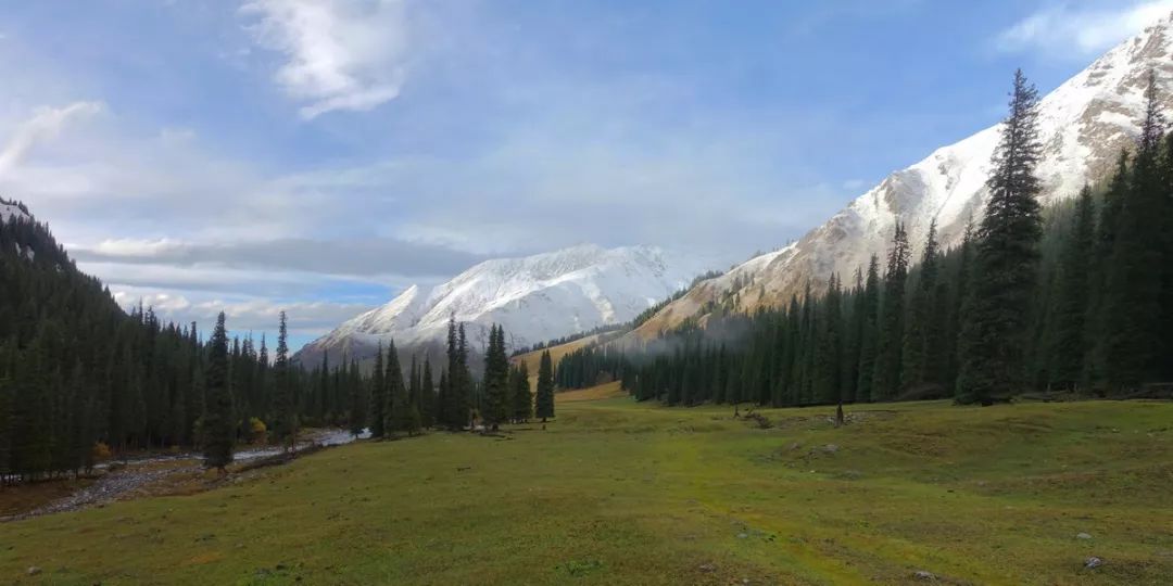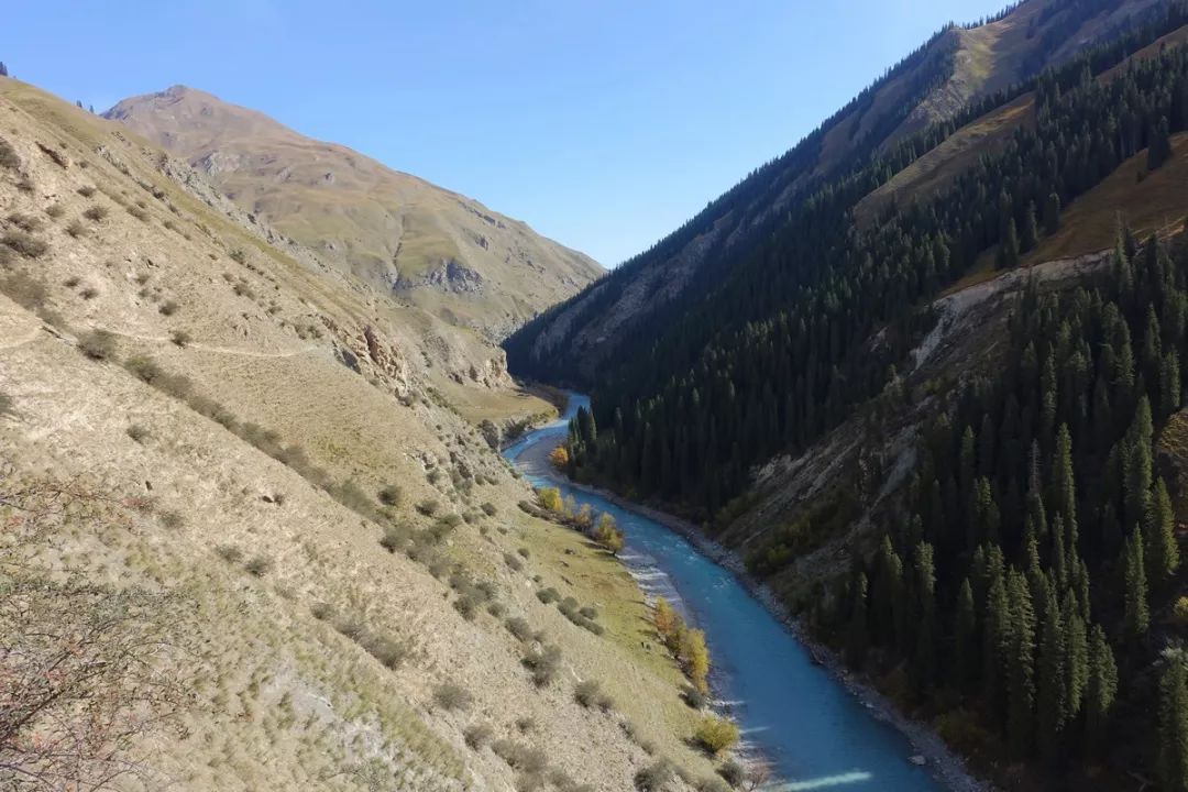 海拔继续下降,植被更为茂密,开始出现大片的草坡。天山区域在此时已经算是深秋,草已变黄,只带有一丁点绿色。