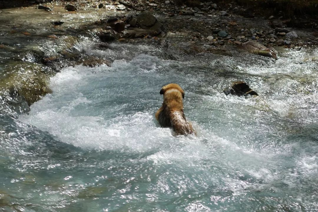 小黄是自力过河,它还会游泳呢。估计此时它在内心里面把我们鄙视了一番。
