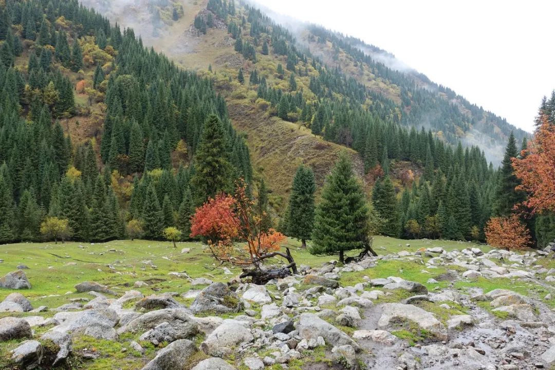 徒步刚开始时海拔偏低,树木较多。走出树林之后是草坡,好在这时雨势变小。草坡上视野相对开阔,举目望去,郁郁葱葱的山林之上,飘散着些许云雾,景色渐入佳境。山上的树及地上的草的主体都还是绿色,但已有少部分树挂满了红叶,仿佛是在告诉我们深秋已至。