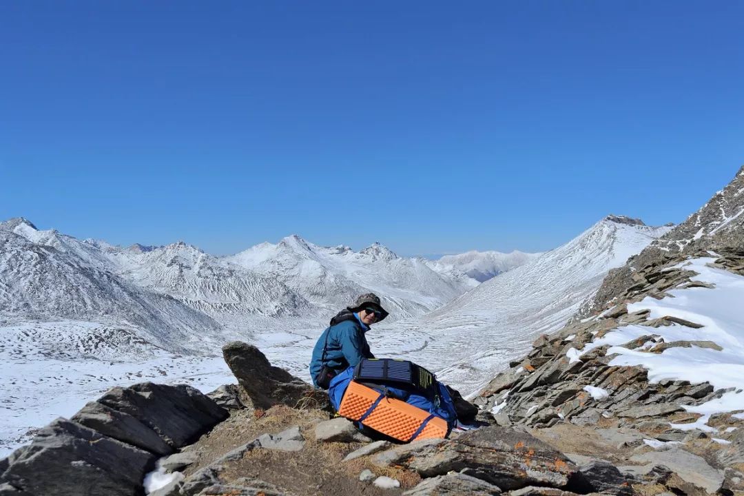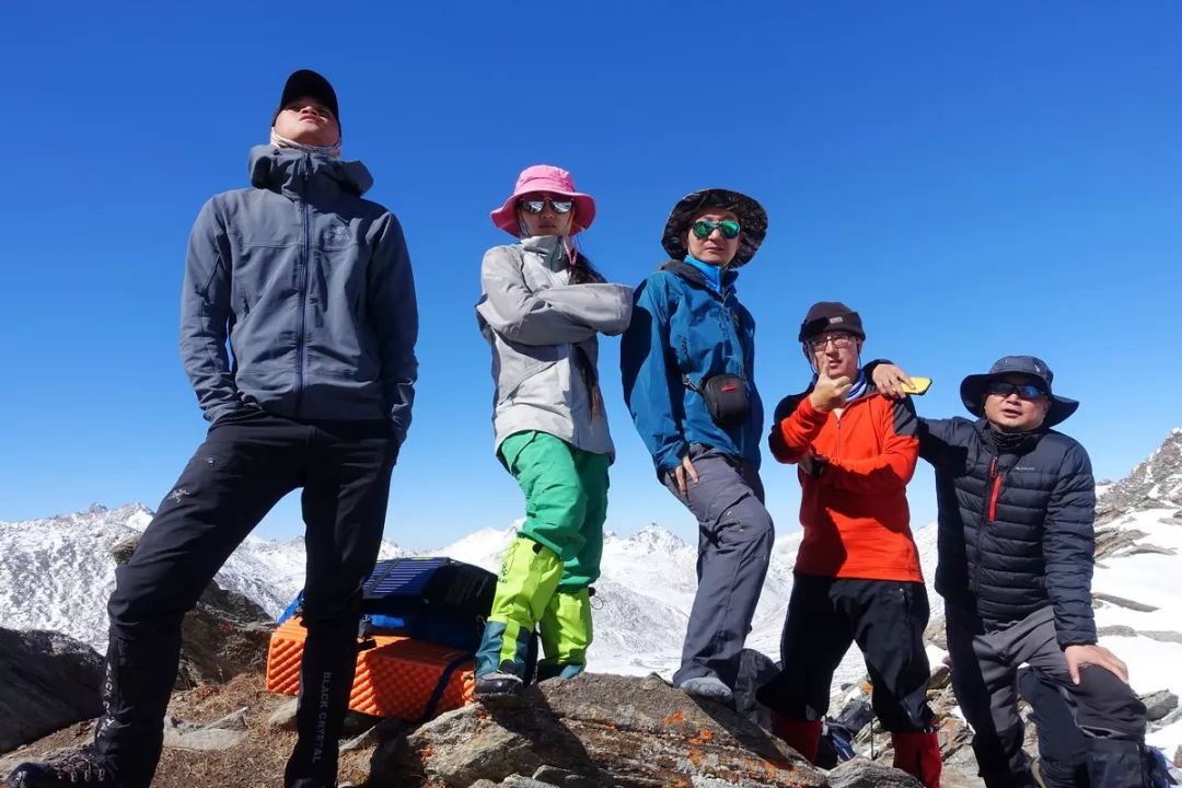 本以为翻过这个陡坡之后就到了达坂顶,然而并不是。接下来是一段平缓的上坡路,很快就走完,然后左拐沿着一条小路继续爬升,就到了琼达坂顶。天气依然晴好,达坂顶上的风很小。趁着等队友的时候,我赶紧把冲锋衣、冰爪、雪套、鞋子、袜子等都脱下,放在太阳底下晾着,重点是要晒鞋和袜子。若是风大,这达坂顶自然不能久留。