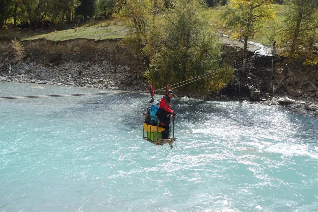 溜索从河这边溜到对岸其实1分钟都不用,时间主要花在上人、下人以及做好安全措施这些方面。这玩意在徒步旺季真是印钞机,就这么一下,破笼子装3个人溜过去,900块钱到手。