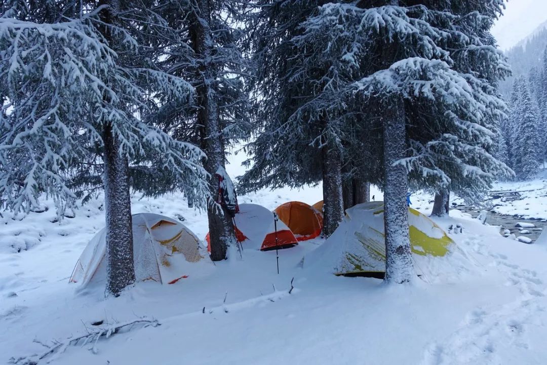 8点是当时日落的时间,但要到9点钟,才彻底黑下来,而8点半之前都还算比较亮。从8点钟开始,我们一边走一边留意合适的营地,最终选定河边的一片小树林:取水方便;位置足够高,不用担心突然涨水漫上来;有树木可以挡风雪。