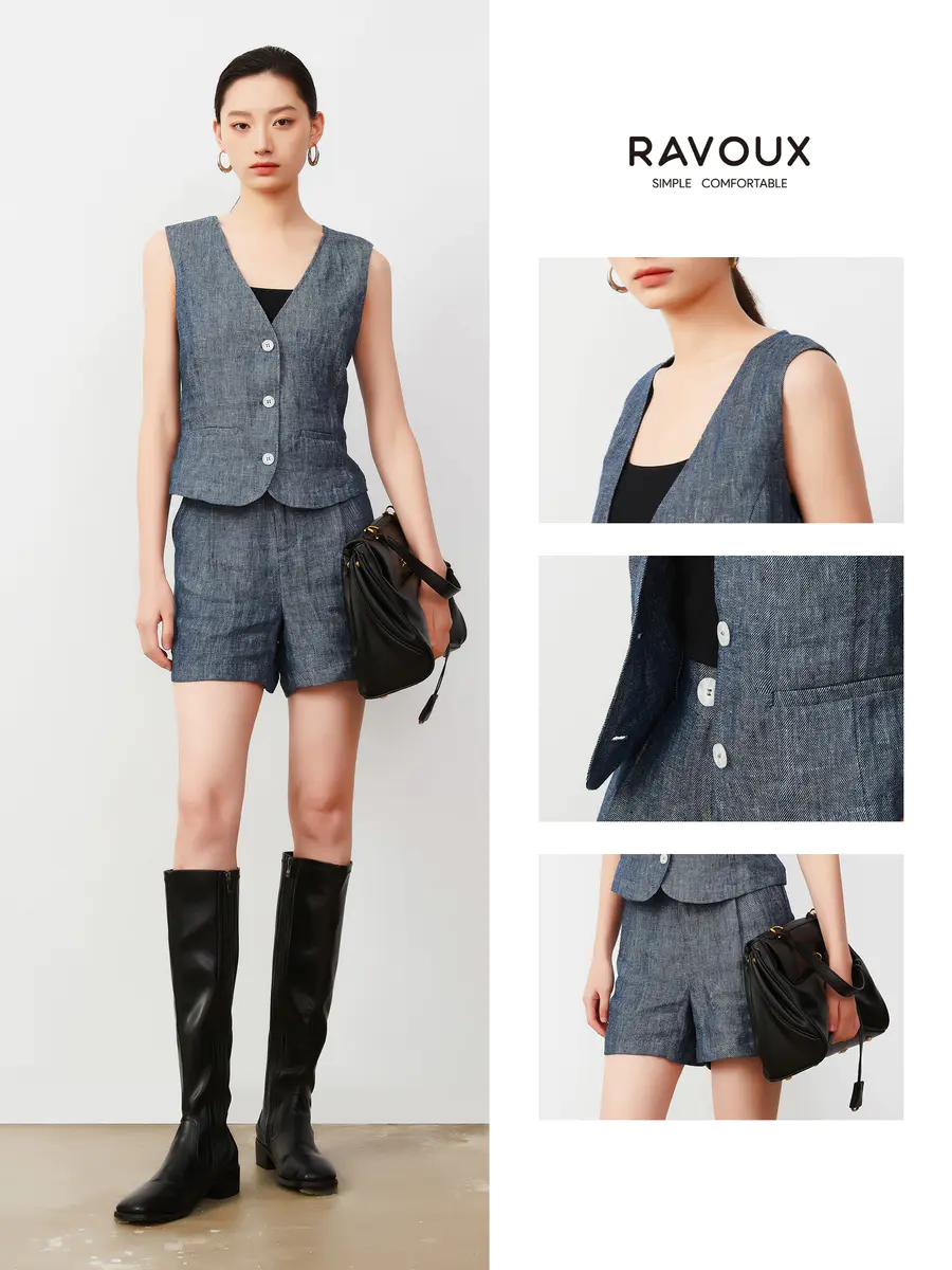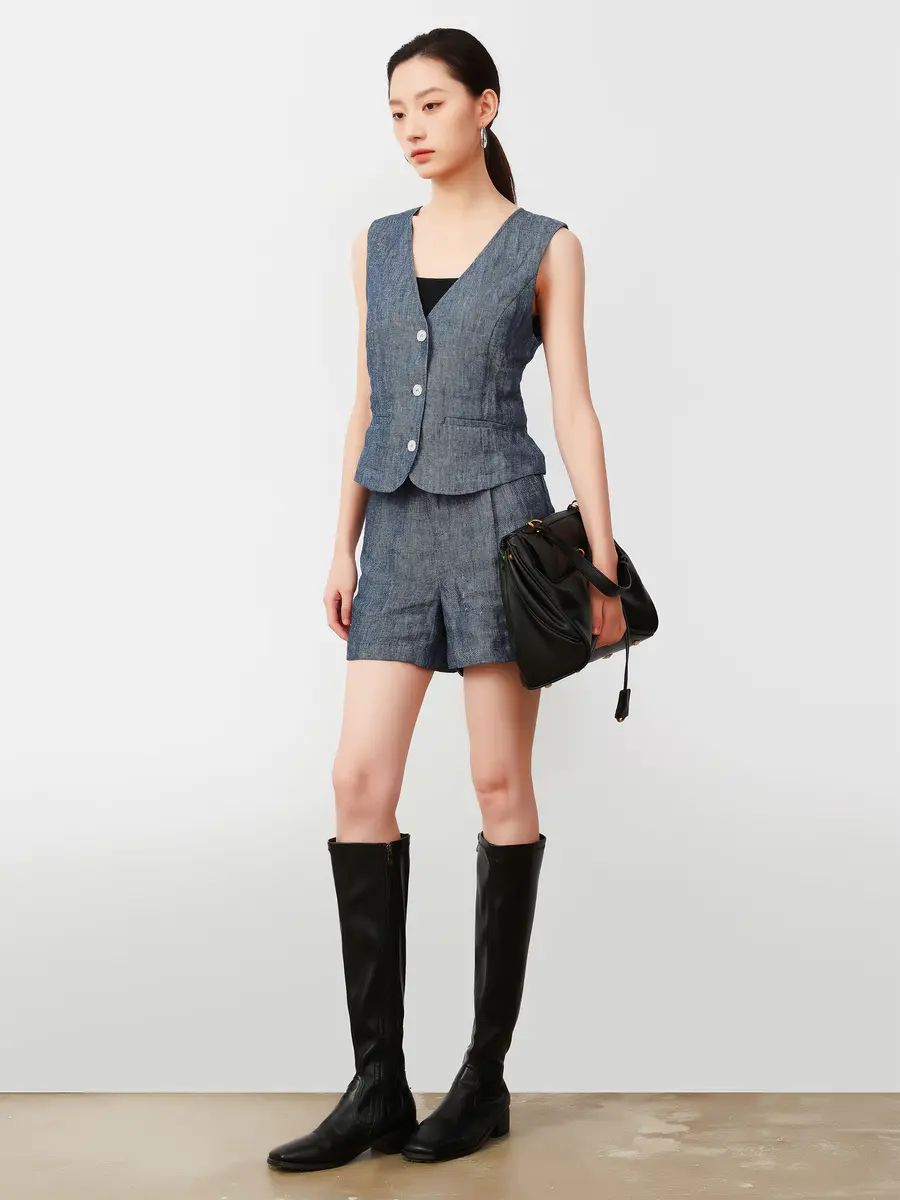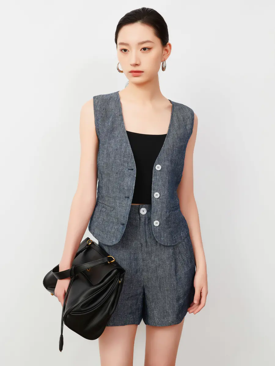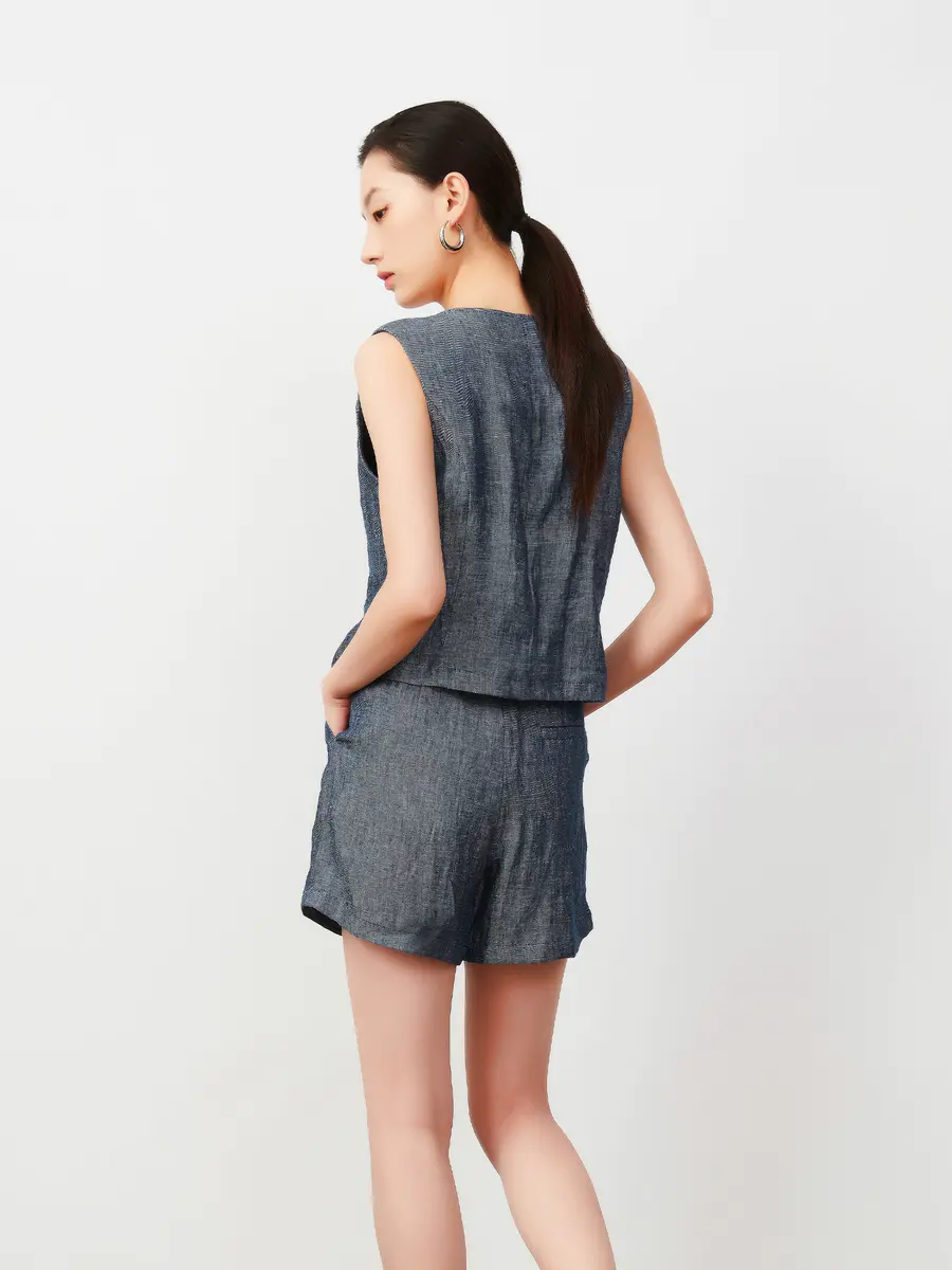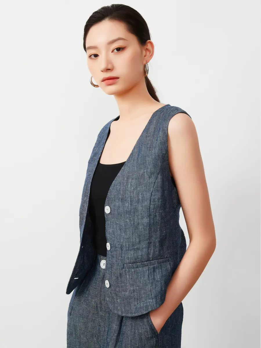 盐系轻奢|高级感亚麻蓝色牛仔马甲套装