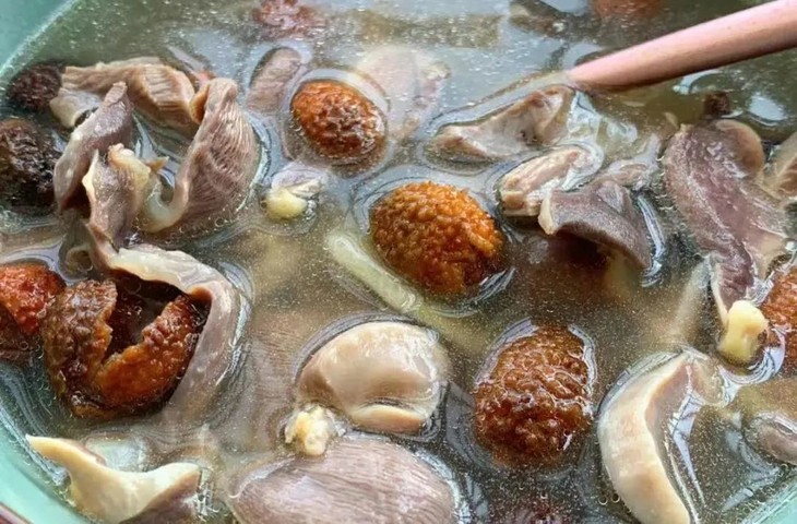4、加入金花坑春砂仁、白术、茯苓,用中小火慢煲1.5小时左右,出锅前加入胡椒粉和食盐调味即可。