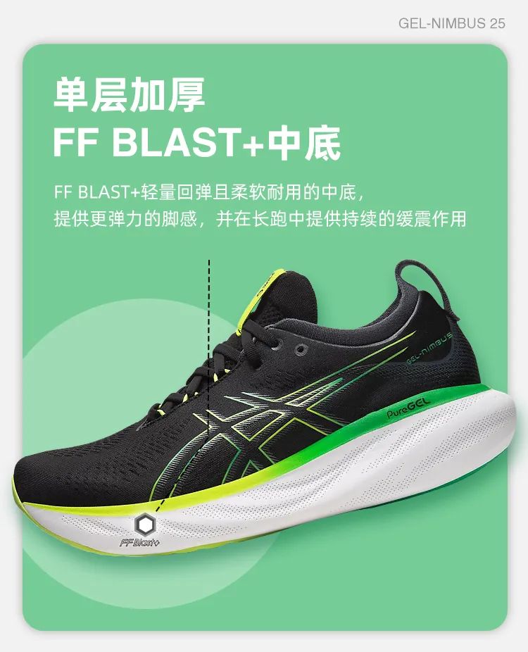 FF BLAST是亚瑟士最具弹性的材质科技系列,在轻量化及耐久度上也表现出优异的性能。此次在Nimbus 25的中低上首次使用的FF BLAST PLUS ECO环保材料,不仅更加轻量,而且让足底发泡增加近20%,连带中底厚度相比24 代也拉升,男款的后跟、前掌高度从26/16mm 变成30/22mm,女款则是28/15mm 增加到29/21mm,用厚底召唤甜蜜缓冲。同时后跟的延伸设计,减少内旋不足型跑者落地时双脚向外偏移的状况,强化稳定性,让跑者每一步都更轻松流畅。