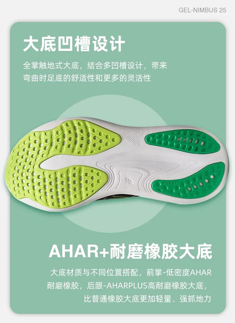NIMBUS 25鞋底的采用竞速旗舰款metaspeed同款设计,前段以AHAR LO 低密度耐磨橡胶提供前爪抓地性,后段则以AHARPLUS 高耐磨橡胶提供后脚跟耐磨性,大底橡胶的挖孔进一步降低了重量。Asics跑步讲师提到,这样的设计能应付一个半马或全马中4-5万连续步伐的摩擦力,一场大战下来这双GEL-NIMBUS 25仍旧会是一条好汉!