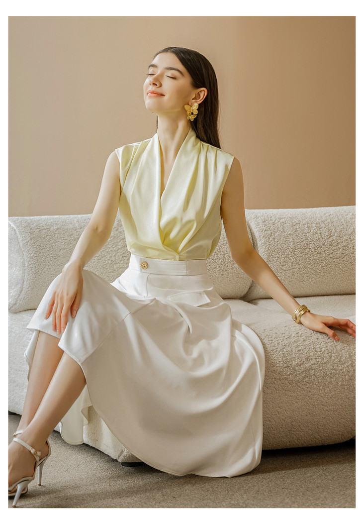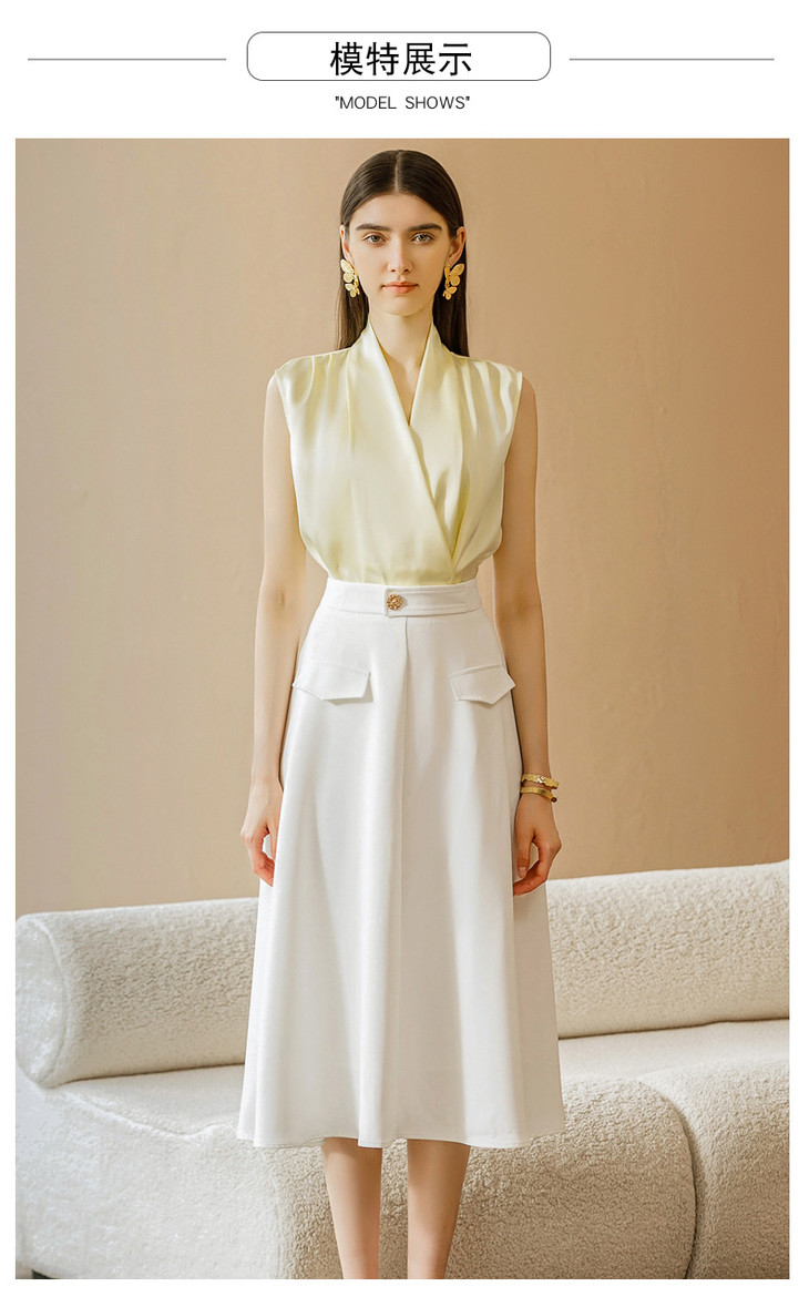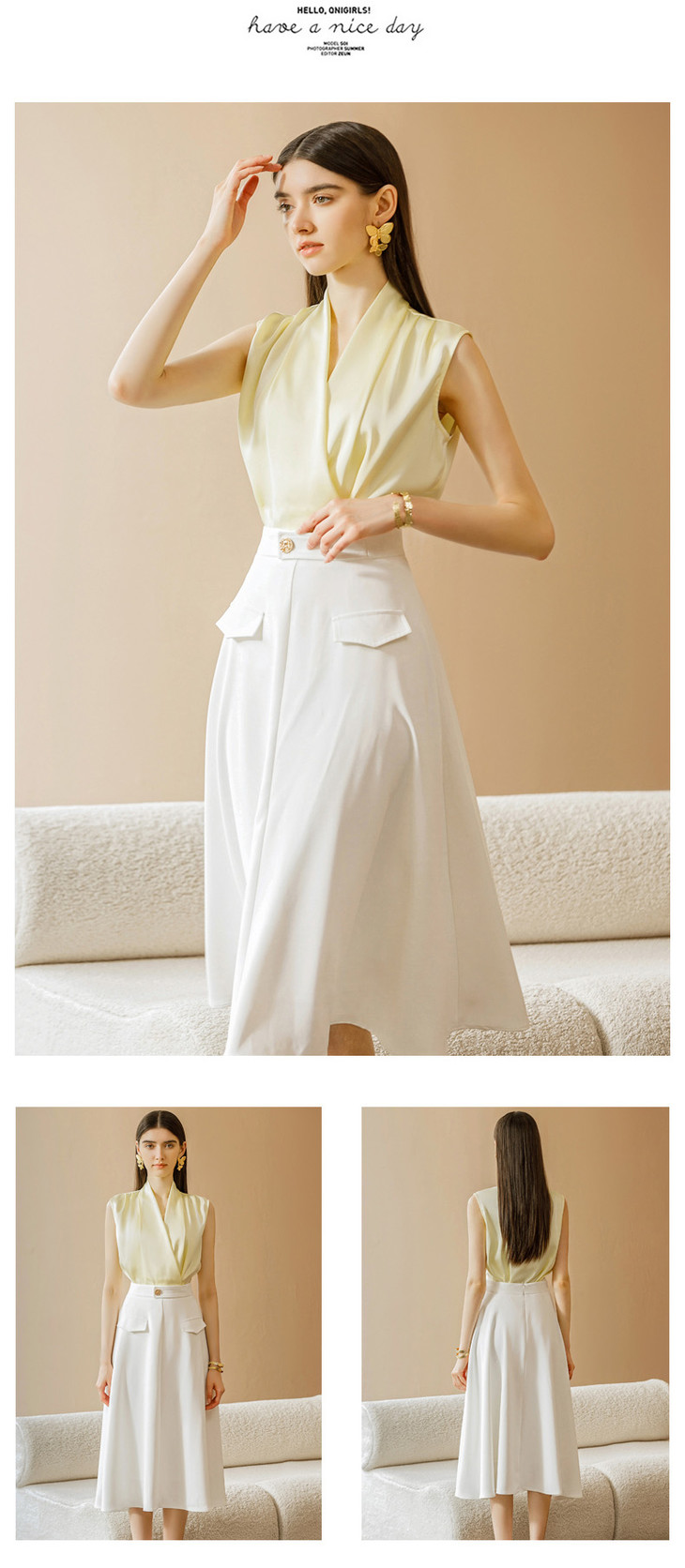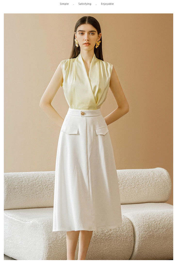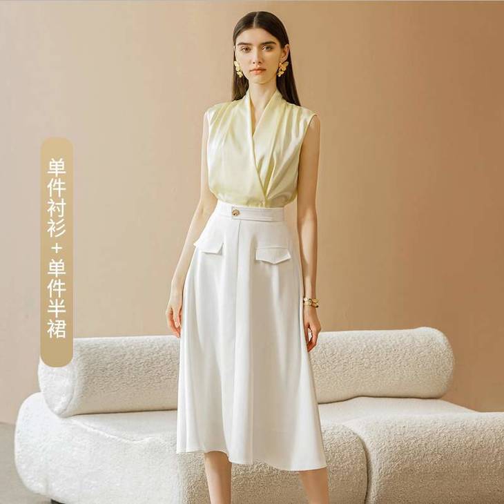IWY浅黄色无袖衬衫及膝长裙套装时尚白领都市职业装