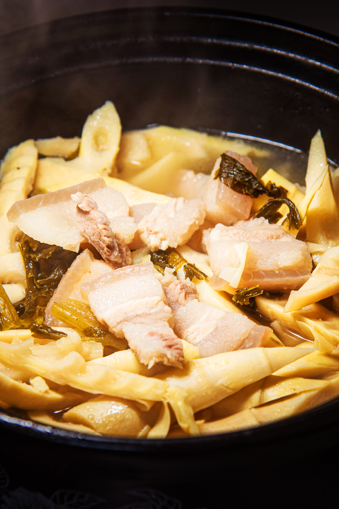 这道菜主要的原料就是苦笋、五花肉和客家咸菜。先将三肥七瘦的五花肉倒入砂锅中充分煸炒,释出油脂;而后加入苦笋一起慢慢翻炒,待苦笋吸够油脂变得滑嫩;再加入高汤和咸菜,慢慢煲足1小时,汤色会逐渐变得清亮,肉、笋、菜三鲜互相成就却又各自美丽。