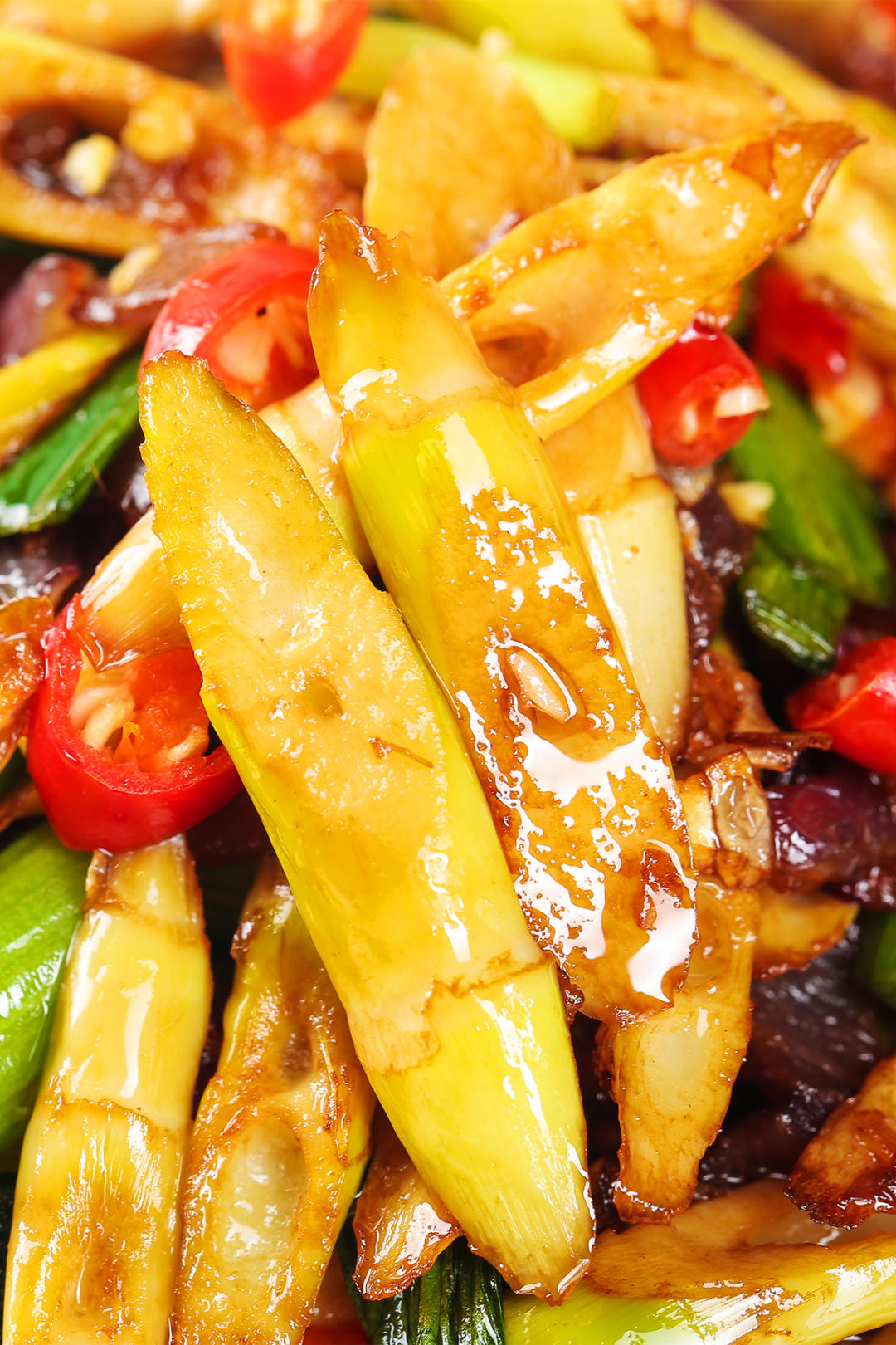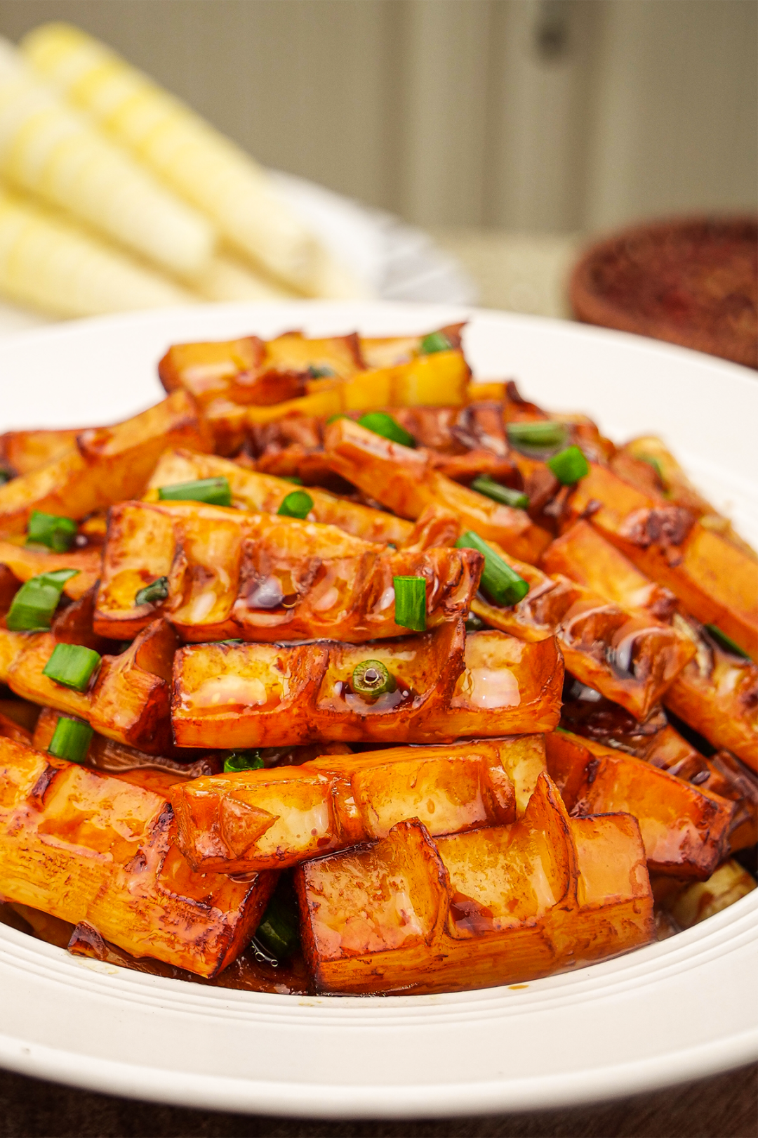 取最鲜嫩的春笋笋肚,切寸段,焯水去涩;热锅宽油,将笋煸至微微焦黄,加入老抽、盐和白糖继续翻炒,小火焖至水分收干,笋块金黄透亮,即可出锅。