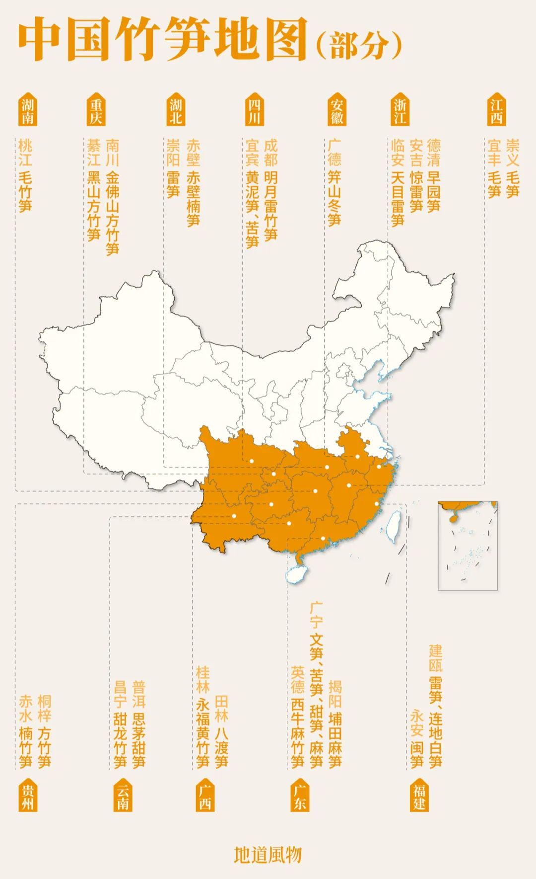 作为世界上竹子种类、产量及占地面积最大的国家,中国成片竹林面积和年产竹材均占世界总量的1/3,我国的竹林遍布27个省份及地区,因着竹笋萌发需要温暖潮湿的环境,所以多半分布在浙江、四川、云南、贵州等南方地区。基本每个南方小孩的记忆里,都少不了一片老家的竹林。