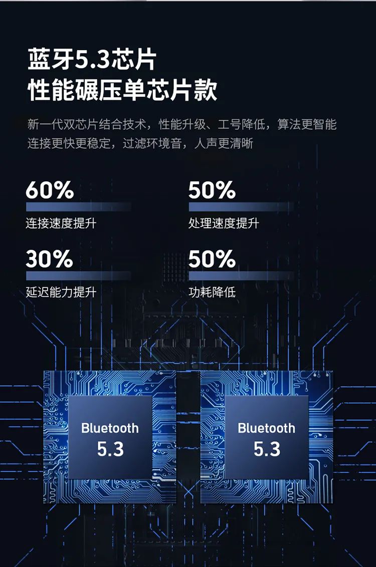 升级版5.3蓝牙芯片,使它信号更稳定穿透性更强,10米稳定连接犹如有线耳机,抗干扰能力更强大,不受其它蓝牙信号源影响,人多也不卡顿。