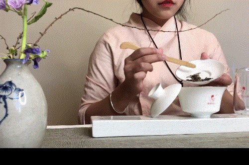 根据冲泡器具的大小和口味的浓淡来定。这里以南茗佳人175毫升白瓷盖碗为冲泡器具,所以称8克《青莲》茶品为佳。