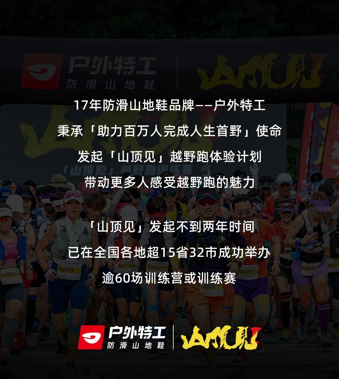 秉承「助力百万人完成人生首野」的使命,17年防滑山地鞋品牌——户外特工发起「山顶见」越野跑体验计划,通过打造体验、教学、竞技等一系列从入门到进阶的越野跑活动,带动更多人感受越野跑的魅力。