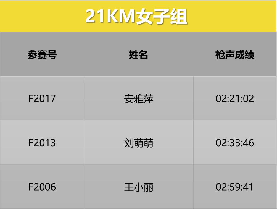 女子组方面,安雅萍以02:21:02的成绩夺得女子组冠军,选手刘萌萌、王小丽分别获得女子亚军和季军。