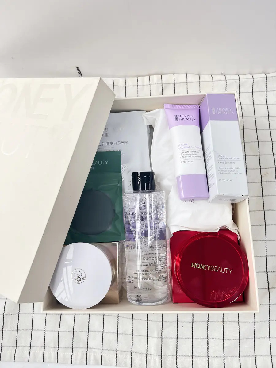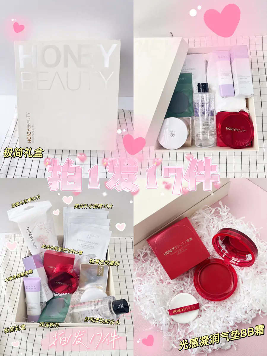 (🎁整个大礼包内含:光感凝润气垫BB霜+轻薄定妆蜜粉+舒润柔肤卸妆水+软管隔离+湿敷化妆棉80片装+光感美白补水面膜*10片+柔感亲肤双面粉扑+极简礼盒)