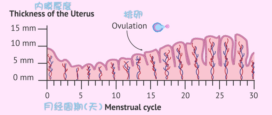 以28-30天月经周期为例,刚来完月经内膜1-3mm, 到排卵前(第12-14天)可到8-12mm, 到下次来月经之前可以很厚约为10-14mm。