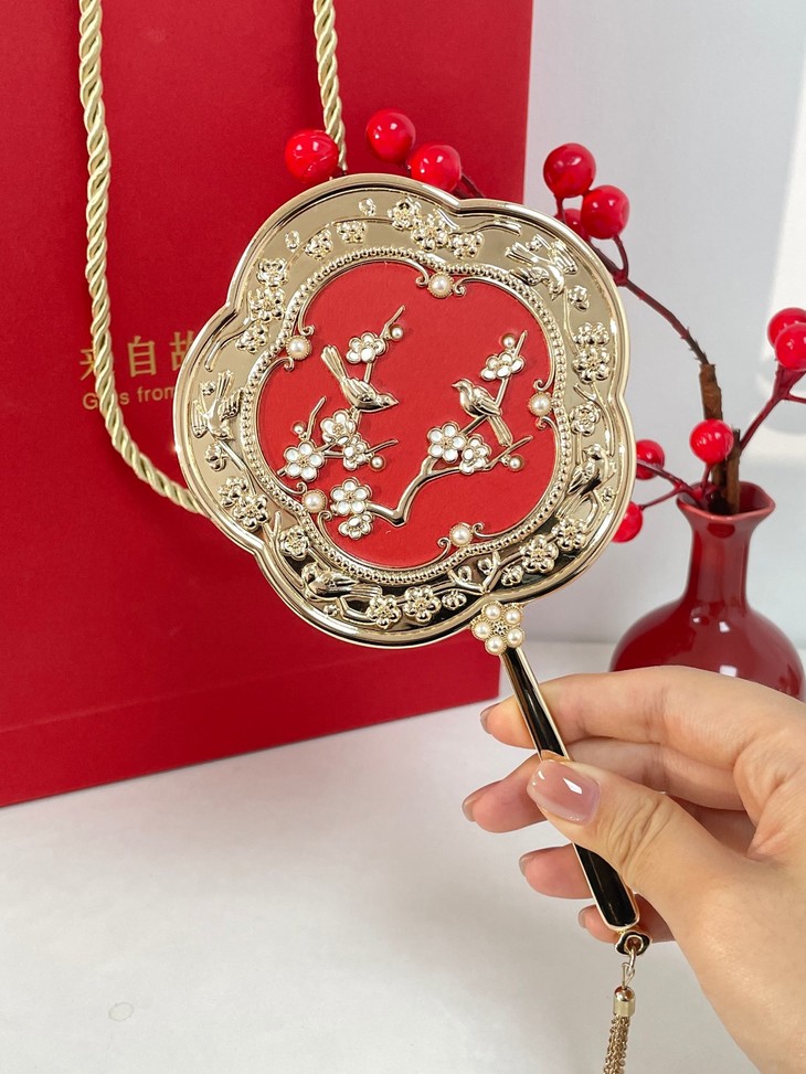 以故宫喜上眉梢镜梳为例,镜子本身有完美、圆满之意,加以喜鹊梅花造型,完满之上更添喜气,是对新娘婚后生活幸福的深深祝愿!