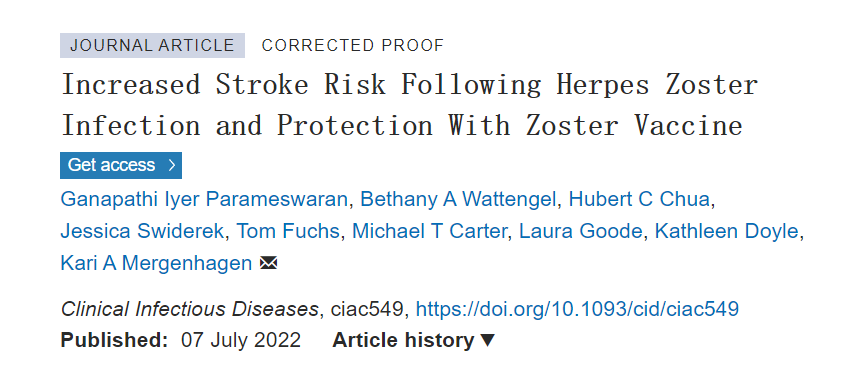近日,美国《临床传染病》杂志官网刊出了一篇研究文章,旨在评估带状疱疹后发生脑卒中(中风)的风险以及带状疱疹疫苗对中风的保护作用 。
