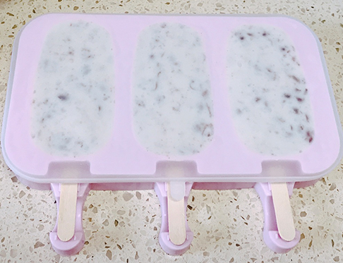 把盛出来的材料放入模具中,轻震几下,固化好后拿出雪糕棍插入(如果是带棍的模具直接放入冰箱冷冻)再冷冻6个小时以上;