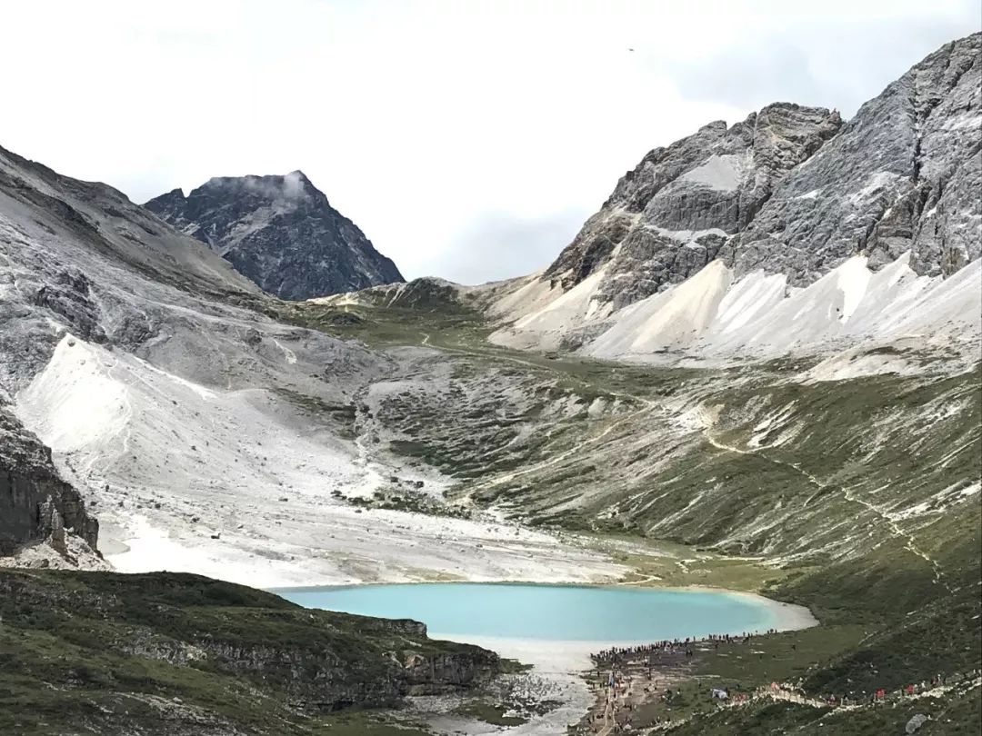 周围的人们纷纷向天上看去,一截彩虹斜挂在云头,惹起阵阵惊叹。珍珠海是一汪碧蓝,雪山为它作配。拍照的时候遭遇冰雹,整座山的兵荒马乱,打伞的穿雨衣的,偏偏是最狼狈的样子,偏偏在这最美的地方。
