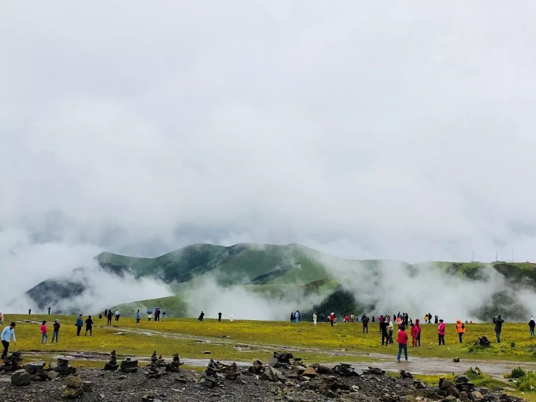 海拔4000多米的海子山与兔儿山藏在云海里,周遭的温度骤然降低,雾气似乎拧得出水来,经幡下的人们还是很多,遍地的玛尼堆是离天空最近的祷告。